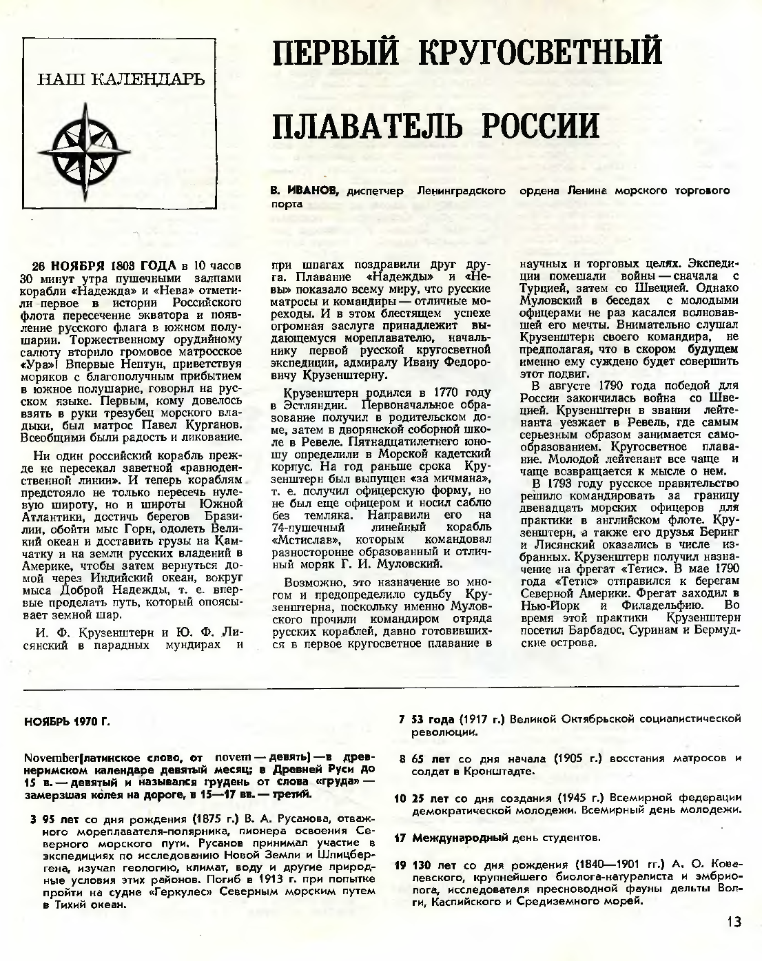Иванов В. Первый кругосветный плаватель России//Морской флот №11 1970 с.13-15