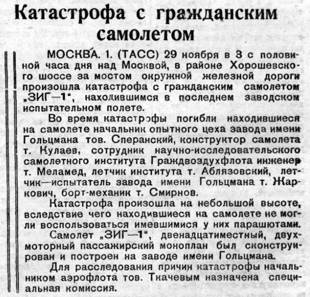 МОСКВА. 1. (ТАСС) 29 ноября в 3 с половиной часа дня над Москвой, в районе Хорошевского шоссе за мостом окружной железной дороги произошла катастрофа с гражданским самолетом „ЗИГ—1“, находившимся в последнем заводском испытательном полете.