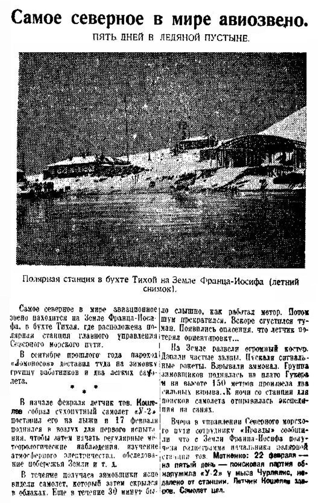 Вчера в управлении Северного морского пути сотруднику «Правды» сообщили что с Земли Франца-Иосифа получена радиограмма начальника полярной станции тов. Мотненко: 22 февраля — на пятый день — поисковая партия обнаружила «У-2» у мыса Чурлялис, недалеко от станции. Летчик Кошелев здоров. Самолет цел.