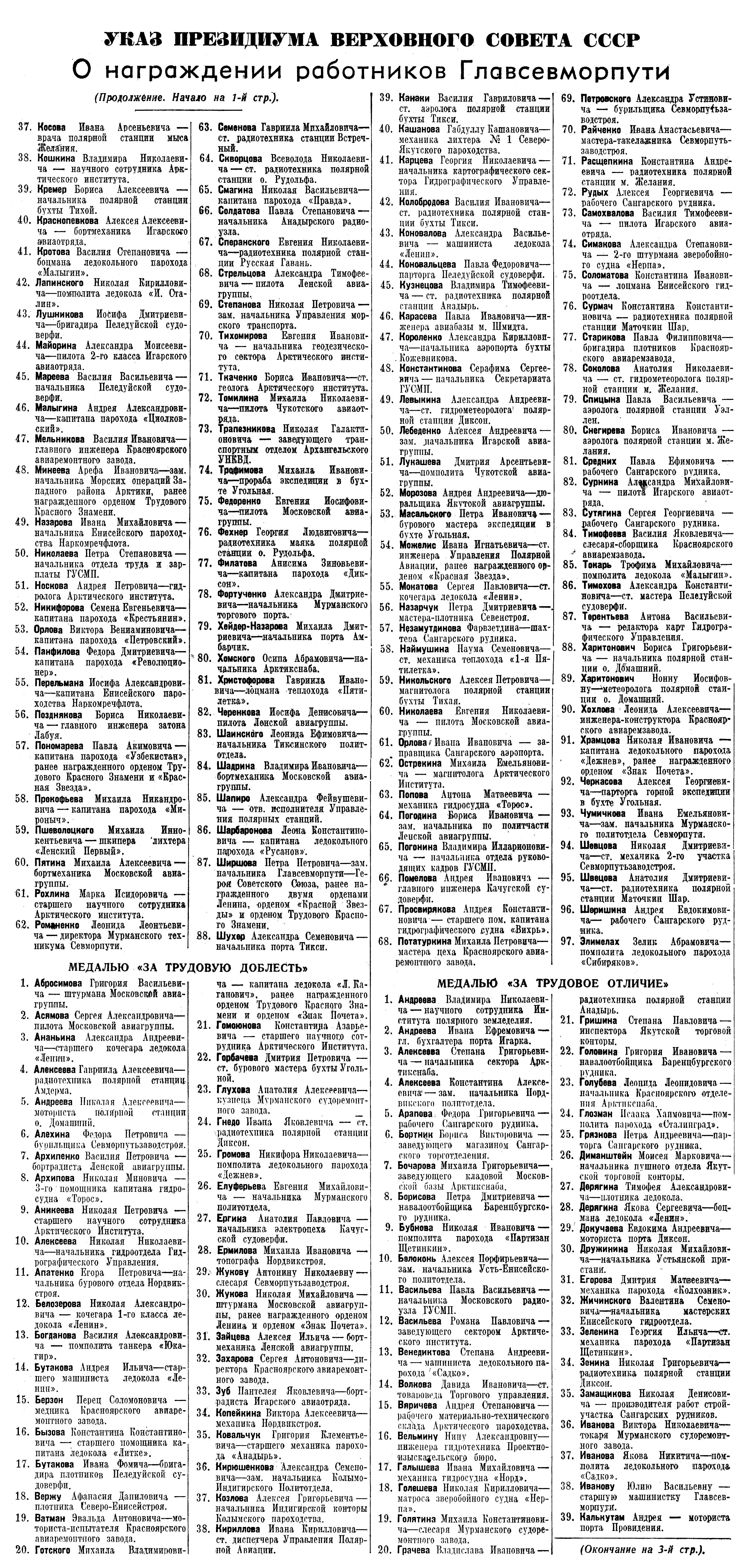 За выдающиеся заслуги в деле освоения Северного Морского Пути и районов Крайнего Севера, а также за образцовую и самоотверженную работу в период арктических навигаций 1938 и 1939 годов наградить: