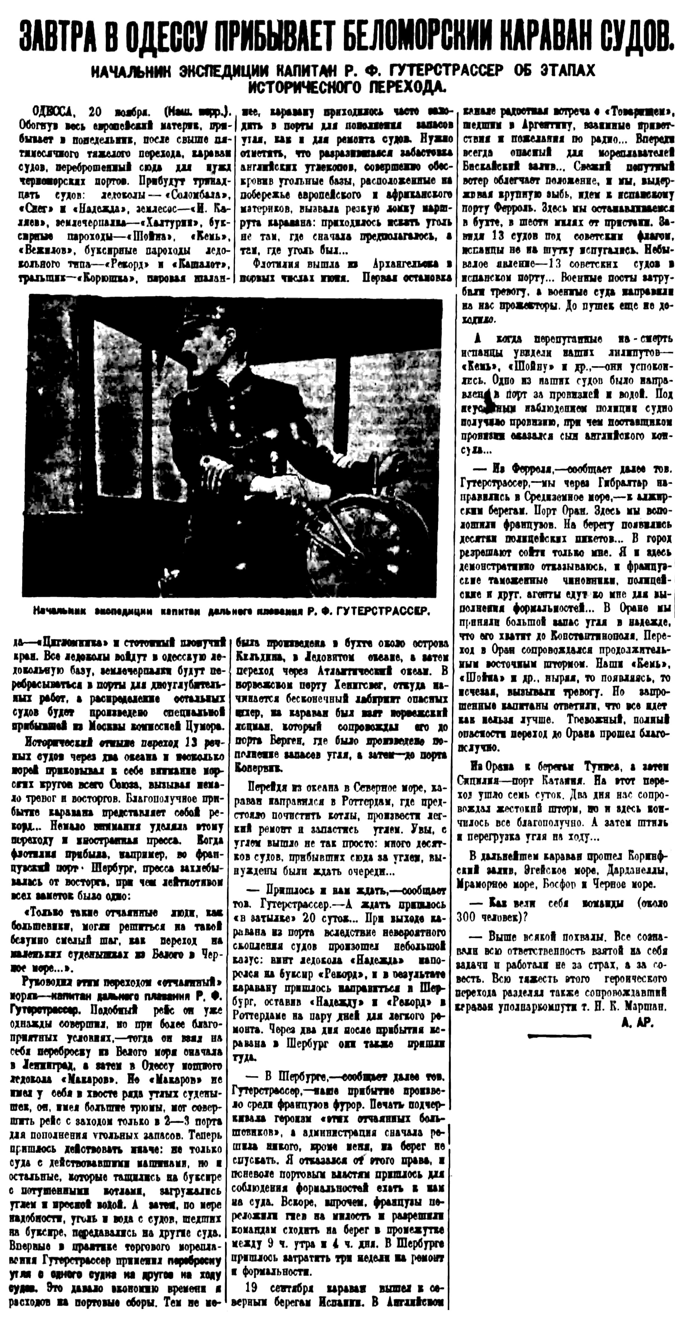 Капитан "Литке" тов. Гутерштрассер известен северянам по беспримерному рейсу целой флотилии, главным образом небольших судов из Архангельска в Черное море. Суда эти, в том числе огромный несамоходный кран, землечерпательный снаряд, несколько буксиров и грузовых пароходов, благополучно доставлены через два океана и несколько морей к месту назначения. Этим незабываемым в мире рейсом пятнадцати судов, совершенным десять лет тому назад, руководил тов. Гутерштрассер.