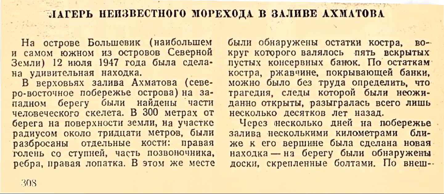 Летопись Севера, том. 1, М., 1949, с. 308-312ЛАГЕРЬ НЕИЗВЕСТНОГО МОРЕХОДА В ЗАЛИВЕ АХМАТОВАНа острове Большевик (наибольшем и самом южном из островов Северной Земли) 12 июля 1947 года была сделана удивительная находка.