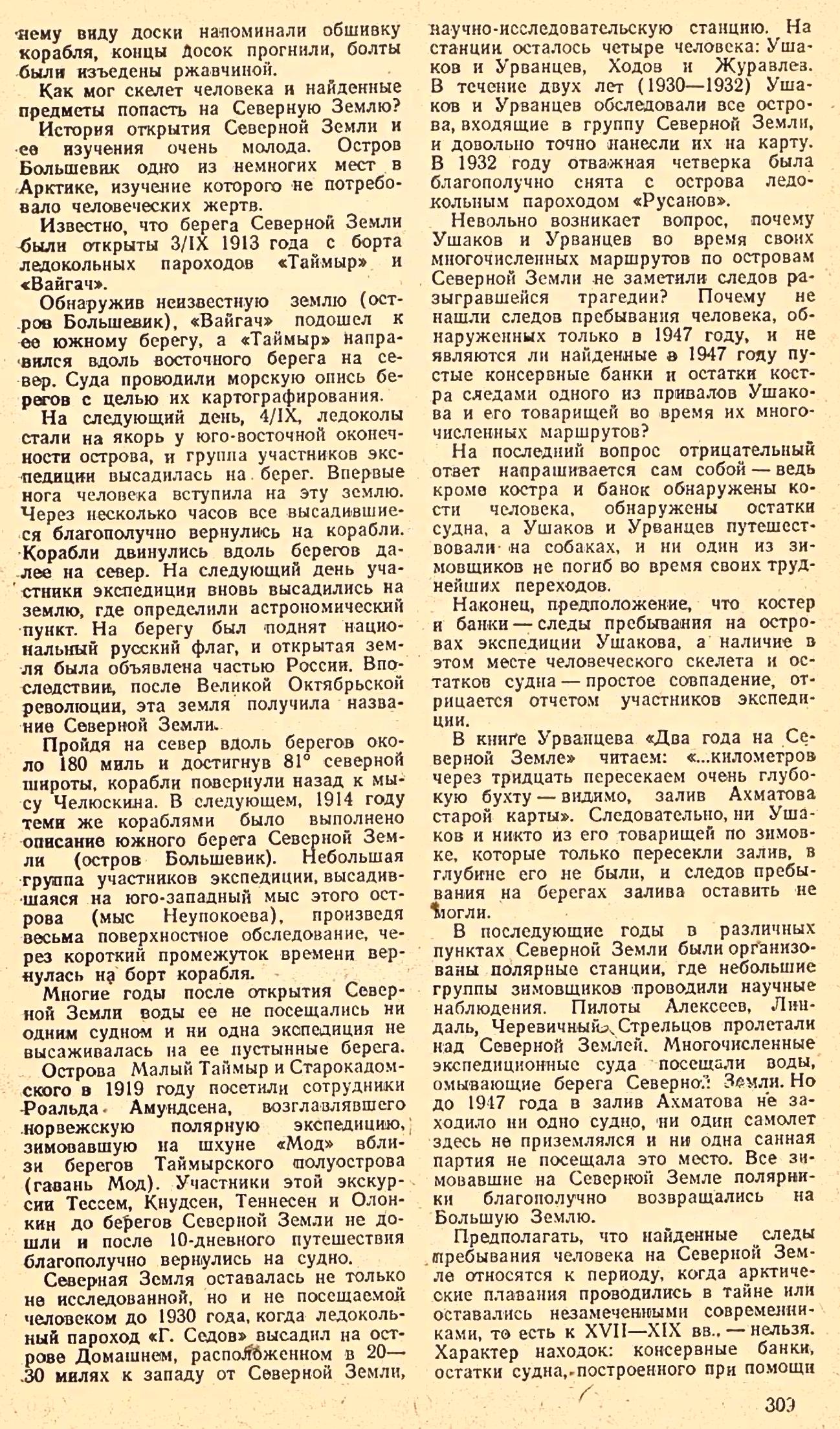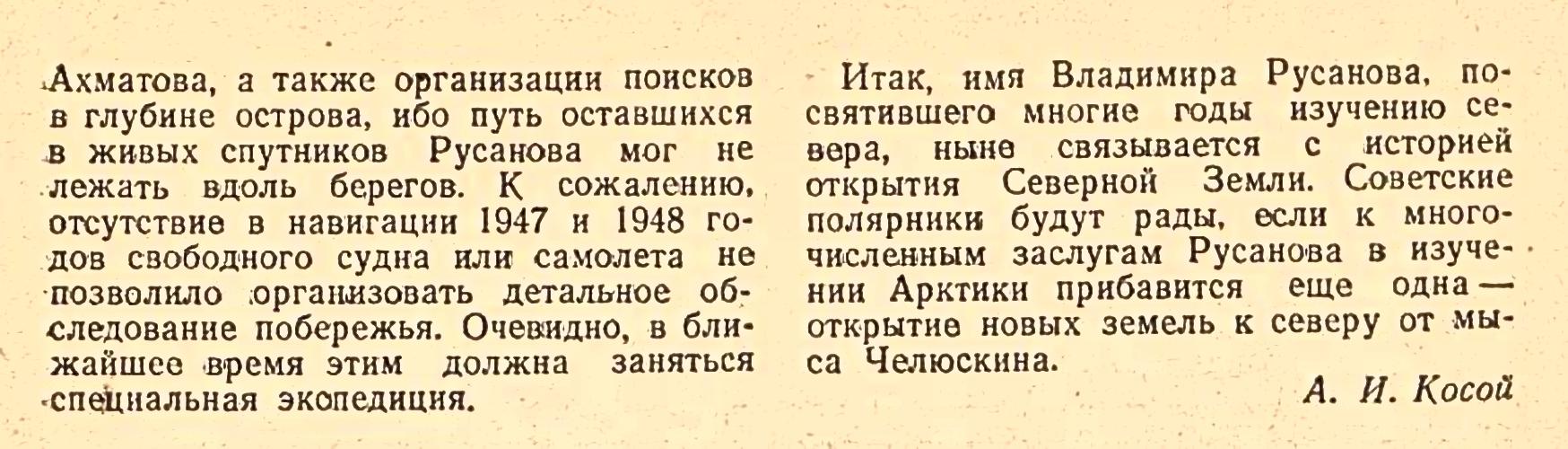 Ахматова, а также организации поисков в глубине острова, ибо путь оставшихся в живых спутников Русанова мог не лежать вдоль берегов. К сожалению, отсутствие в навигации 1947 и 1948 годов свободного судна или самолета не позволило организовать детальное обследование побережья. Очевидно, в ближайшее время этим должна заняться специальная экспедиция.