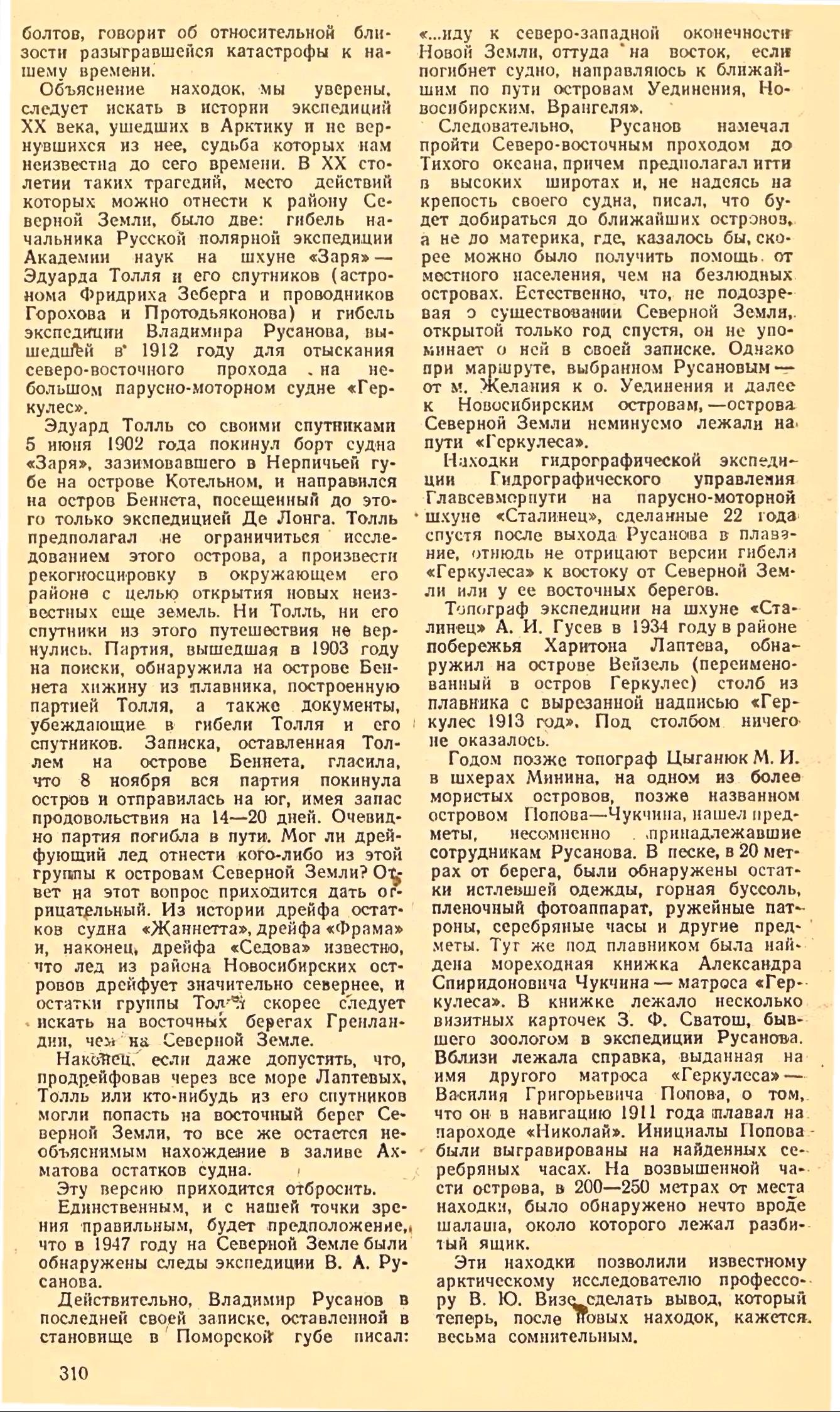 Итак, имя Владимира Русанова, посвятившего многие годы изучению севера, ныне связывается с историей открытия Северной Земли. Советские полярники будут рады, если к многочисленным заслугам Русанова в изучении Арктики прибавится еще одна — открытие новых земель к северу от мыса Челюскина.