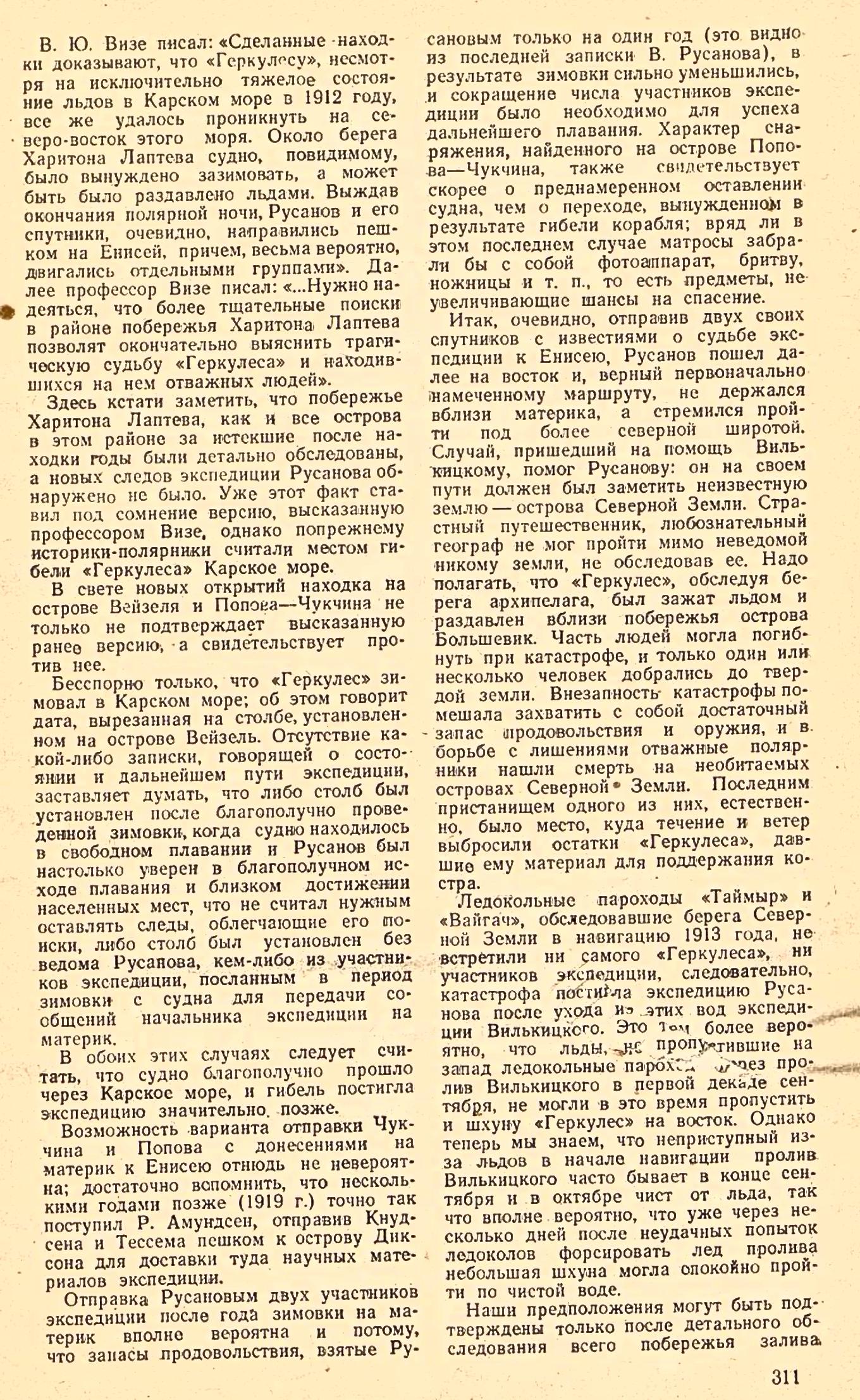 В. Ю. Визе писал: «Сделанные находки доказывают, что «Геркулесу», несмотря на исключительно тяжелое состояние льдов в Карском море в 1912 году, все же удалось проникнуть на северо-восток этого моря. Около берега Харитона Лаптева судно, Повидимому, было вынуждено зазимовать, а может быть было раздавлено льдами. Выждав окончания полярной ночи, Русанов и его спутники, очевидно, направились пешком на Енисей, причем, весьма вероятно, двигались отдельными группами». Далее профессор Визе писал: «... Нужно надеяться, что более тщательные поиски в районе побережья Харитона: Лаптева позволят окончательно выяснить трагическую судьбу «Геркулеса» и находившихся на нем отважных людей».