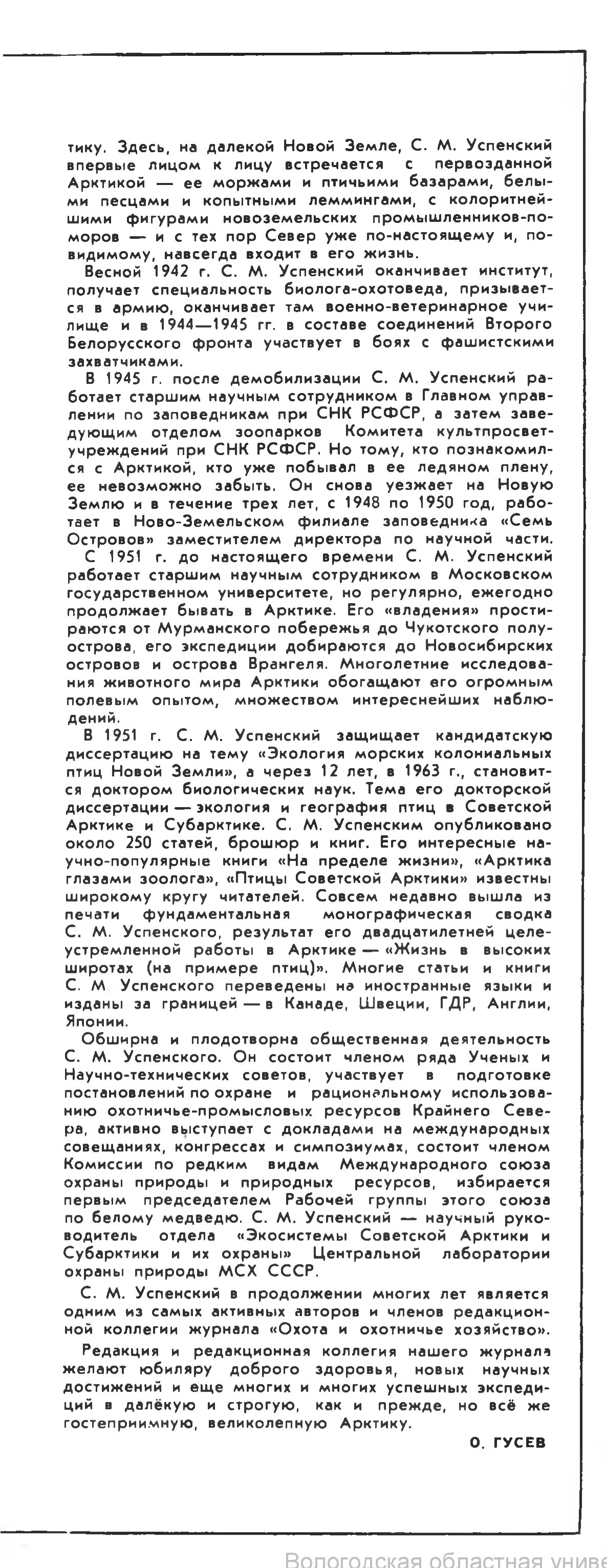 Гусев О.Савва Михайлович Успенский (к 50-летию со дня рождени)// Охота и охотничье хозяйство 1970_12