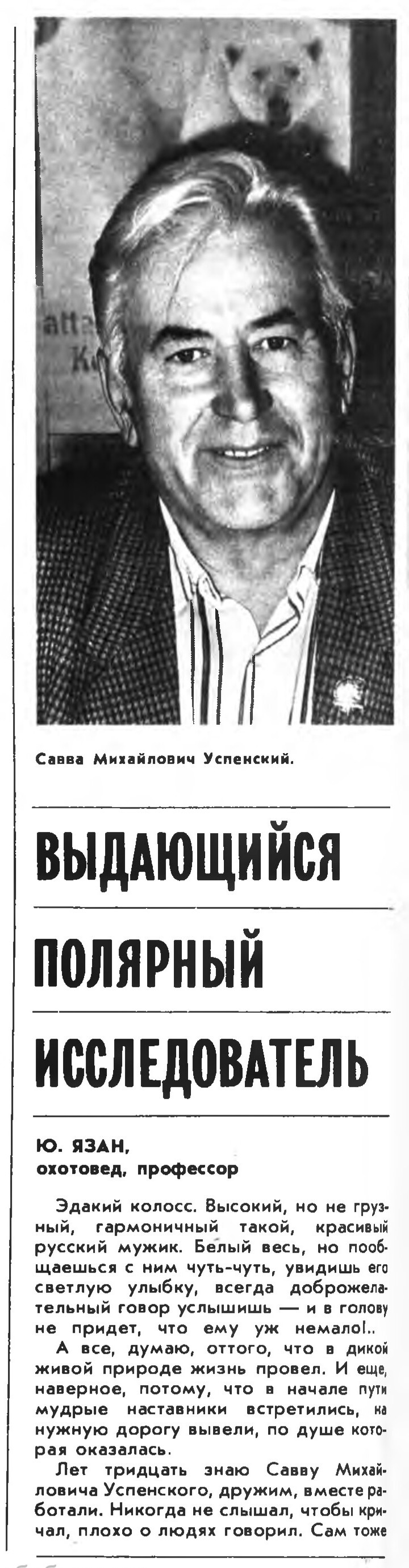 16 апреля 1996 года в одной из московских больниц скоропостижно скончался Савва Михайлович Успенский. С его именем связаны многие славные страницы изучения и сохранения природы Арктики. Большую роль сыграл Савва Михайлович и в моей жизни. Он терпеливо приобщал меня к работе в Арктике, ему я во-многом обязан тем, что «арктический вирус» навсегда поселился в моей душе.