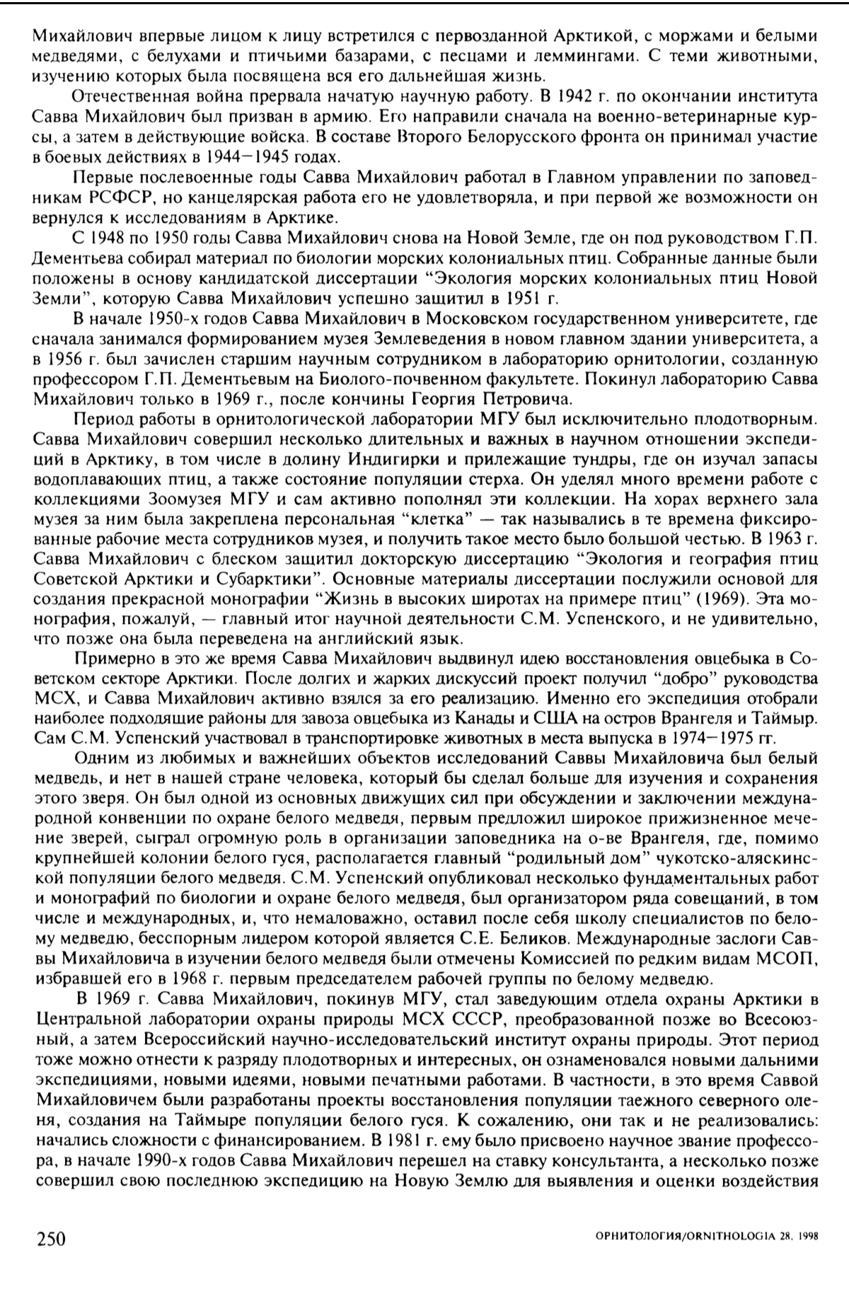 Оглядываясь назад и вспоминая Савву Михайловича, я хотел бы в представленных ниже кратких заметках отметить не его научные заслуги и достижения (об этом прекрасно написал В.Е.Флинт в некрологе, посвященном памяти Саввы Михайловича Успенского. См. ж-нал «Орнитология», вып. 28, 1998), а поведать о том, сколь одержимым и противоречивым был этот человек и каким он был в минуты, когда не надо было поддерживать привычный для окружающих имидж знаменитого полярного исследователя. Право на это мне дает многолетнее общение с Саввой Михайловичем и в стенах лаборатории, которой он руководил, и в полярных экспедициях.