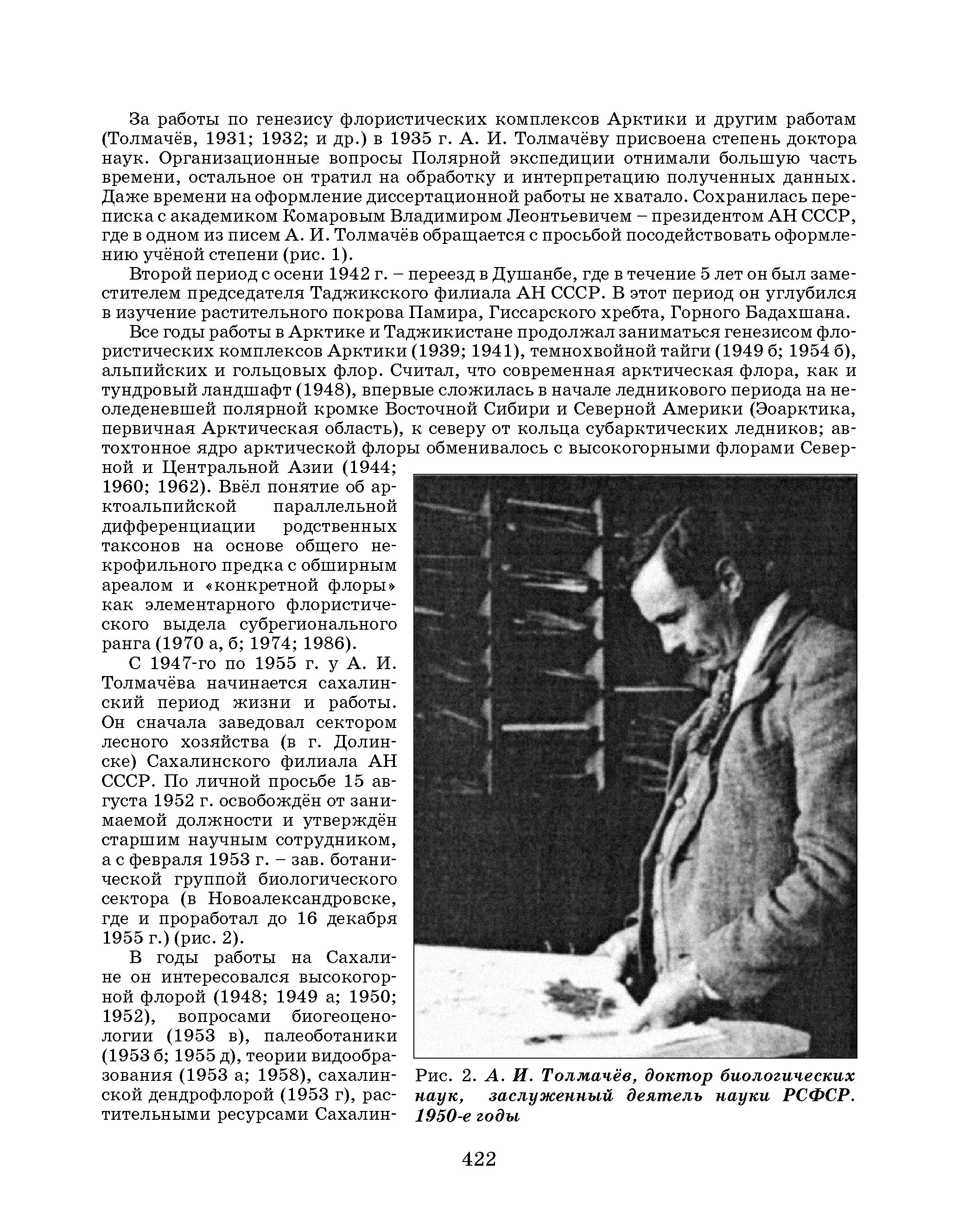 За работы по генезису флористических комплексов Арктики и другим работам (Толмачёв, 1931; 1932; и др. ) в 1935 г. А. И. Толмачёву присвоена степень доктора наук. Организационные вопросы Полярной экспедиции отнимали большую часть времени, остальное он тратил на обработку и интерпретацию полученных данных. Даже времени на оформление диссертационной работы не хватало. Сохранилась переписка с академиком Комаровым Владимиром Леонтьевичем - президентом АН СССР, где в одном из писем А. И. Толмачёв обращается с просьбой посодействовать оформлению учёной степени (рис. 1).