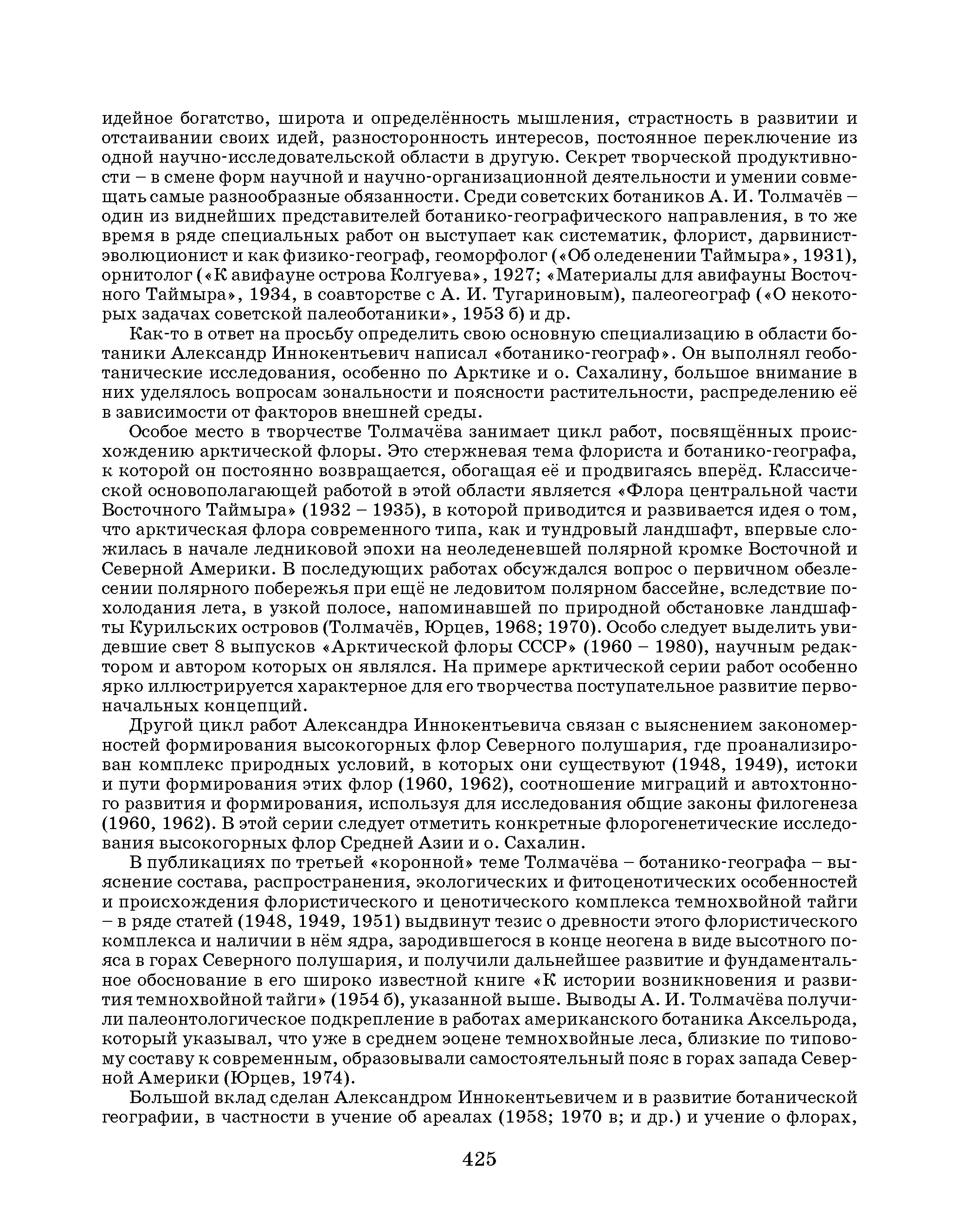Доктор биологических наук Б. А. Юрцев - заведующий лабораторией растительности Крайнего Севера Ботанического института им. В. Л. Комарова РАН вспоминает первые годы работы в БИНе, когда в начале 1956 г., после сахалинского периода деятельности, вернулся один из самых высокообразованных ботаников - Александр Иннокентьевич Толмачёв. Он начинал работу над созданием «Арктической флоры СССР» (первые два тома в хронологическом порядке выпуска «Флоры» были подготовлены А. И. Толмачёвым единолично) (илл. 4).