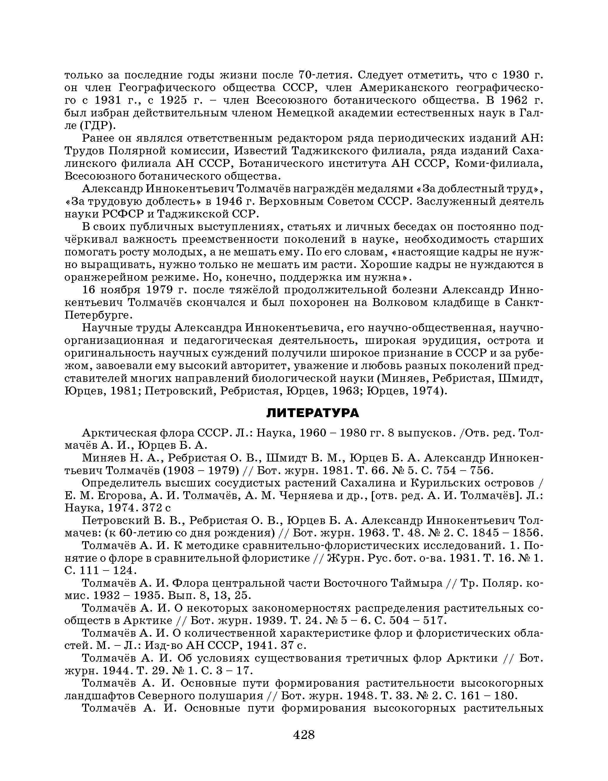 Миняев Н. А., Ребристая О. В., Шмидт В. М., Юрцев Б. А. Александр Иннокентьевич Толмачёв (1903 - 1979) // Бот. журн. 1981. Т. 66. № 5. С. 754 - 756.