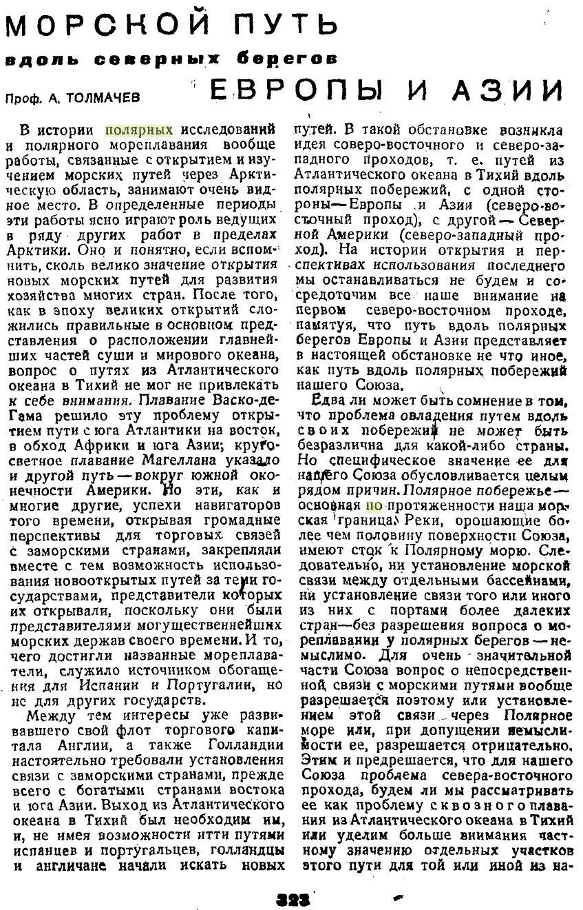 Толмачёв А.Морской путь вдоль северных берегоа Европы и Азии//Вестник знаний 1933 с.323-328