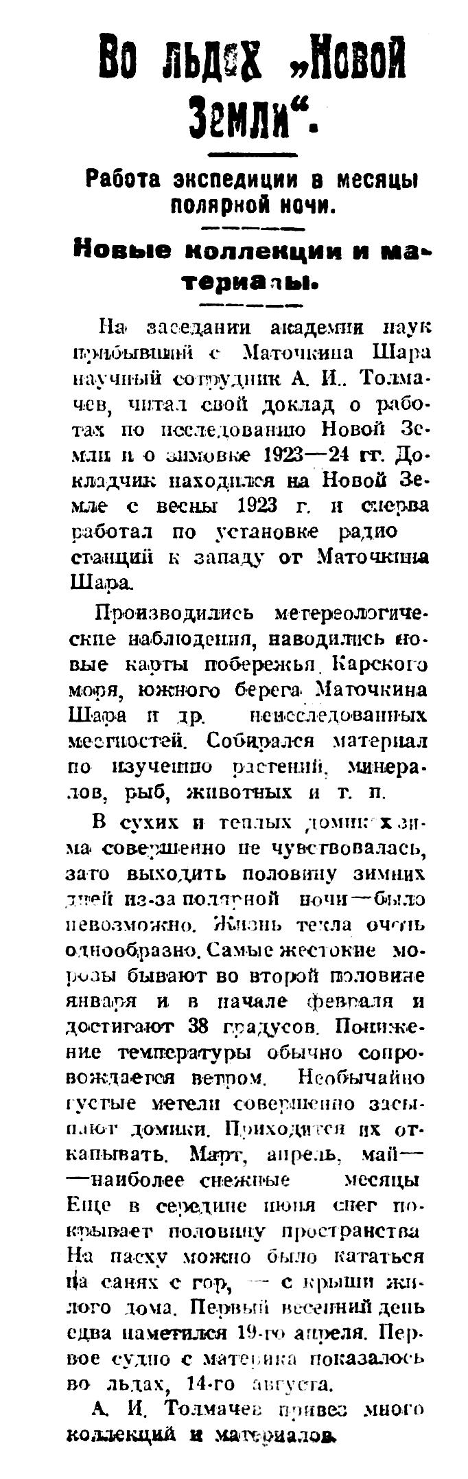 На заседании академии наук прибывший с Маточкина Шара научный сотрудник А. И. Толмачев, читал свой доклад о работах по исследованию Новой Земли и о зимовке 1923—24 гг. Докладчик находился на Новой Земле с весны 1923 г. и сперва работал по установке радио станций к западу от Маточкина Шара.