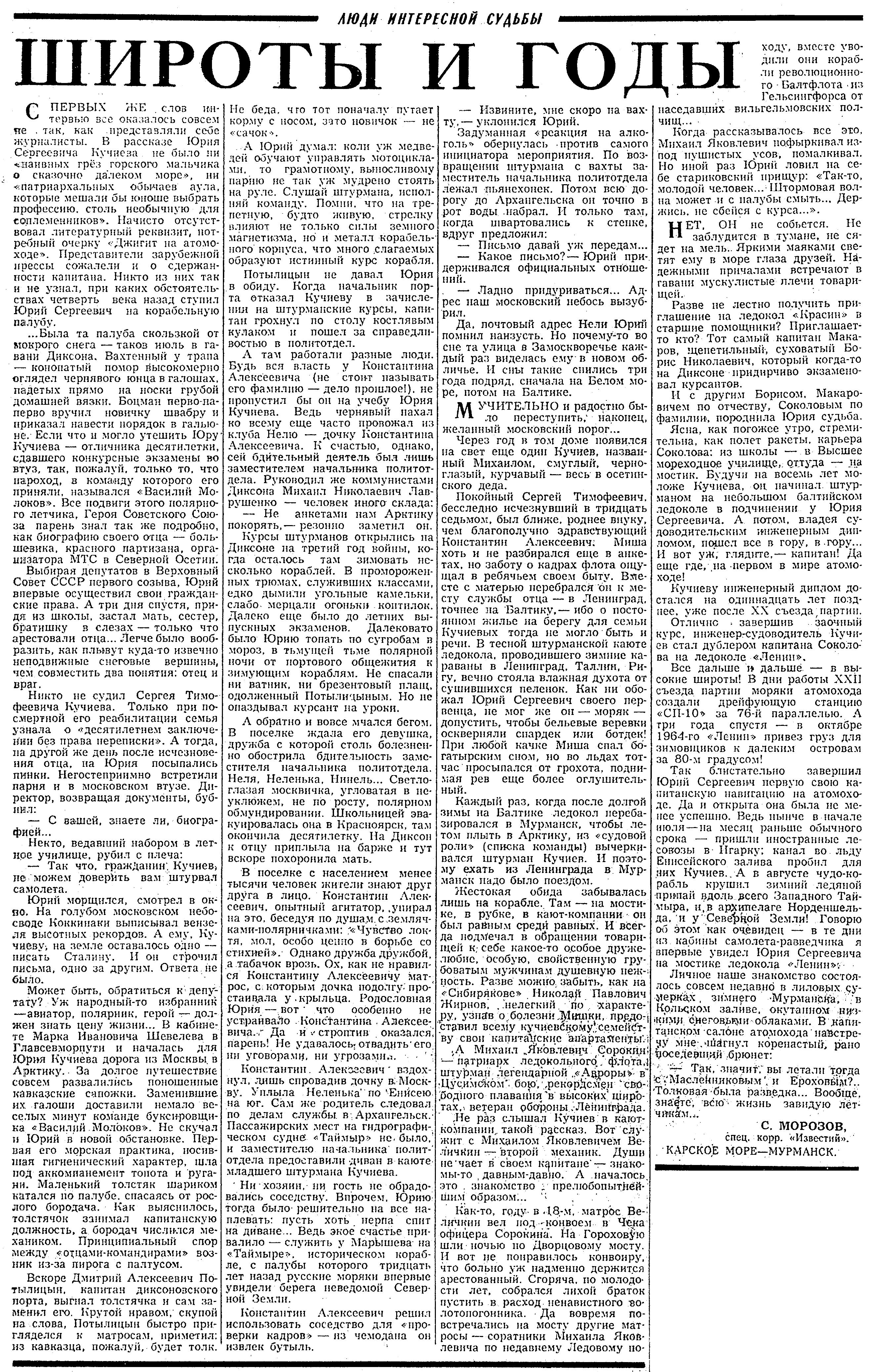 ... Была та палуба скользкой от мокрого снега — таков июль в гавани Диксона. Вахтенный у трапа — конопатый помор высокомерно оглядел чернявого юнца в галошах, надетых прямо на носки грубой домашней вязки. Боцман перво-наперво вручил новичку швабру и приказал навести порядок в гальюне. Если что и могло утешить Юру Кучиева — отличника десятилетки, сдавшего конкурсные экзамены во втуз, так, пожалуй, только то, что пароход, в команду которого его приняли, назывался «Василий Молоков». Все подвиги этого полярного летчика, Героя Советского Союза парень знал так же подробно, как биографию своего отца — большевика, красного партизана, организатора МТС в Северной Осетии.