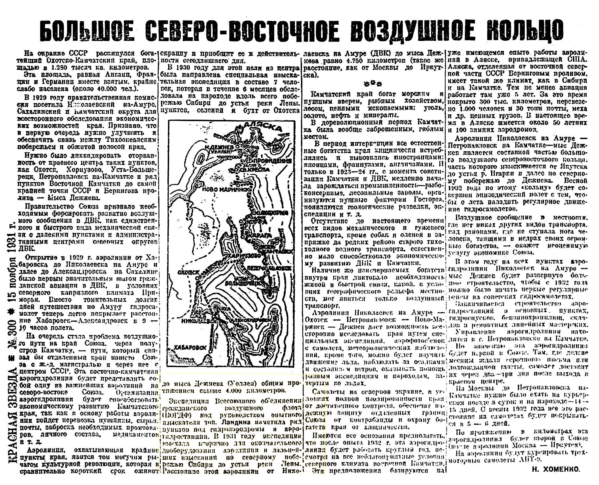 Аэролиния Николаевск на Амуре — Петропавловск на Камчатке — мыс Дежнев является составной частью большого воздушного северовосточного кольца, часть которого изыскивается от Якутска до устья р. Игарки и далее по северному побережью до Дежнева. Весной 1932 года по этому «кольцу» будет совершен эпизодический полет с тем, чтобы с лета наладить регулярное движение гидросамолетов.