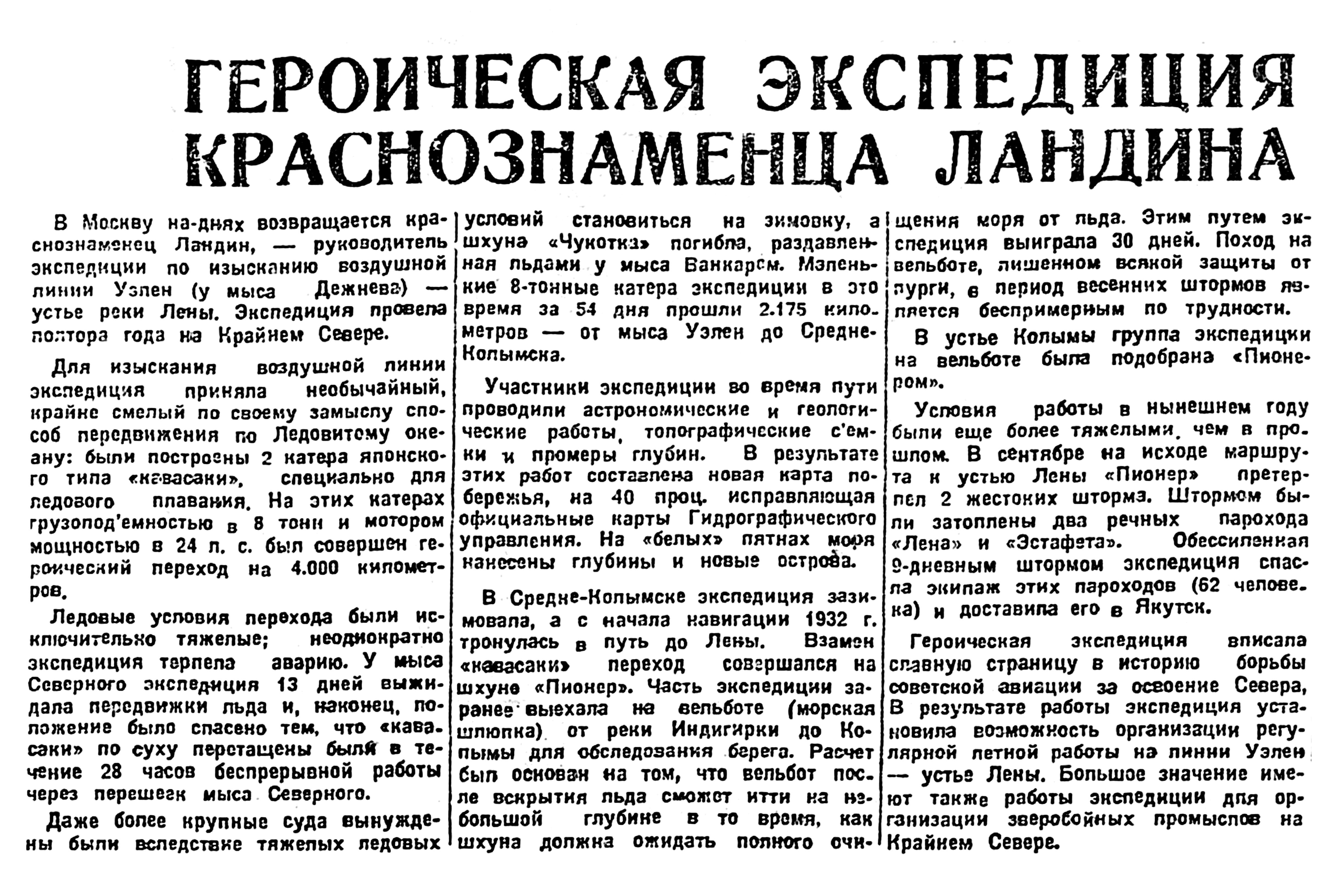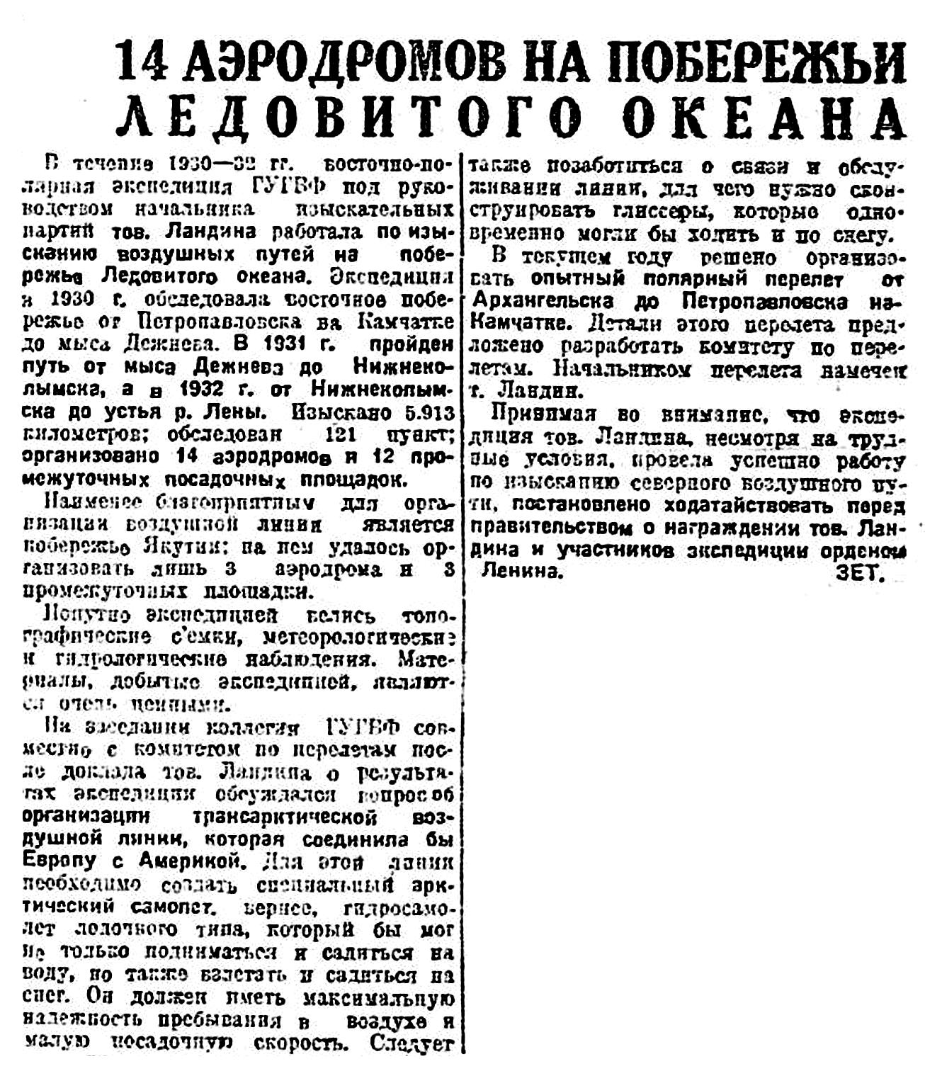 Экспедиция Всесоюзного объединения гражданского воздушного флота (ВОГДФ) под руководством опытного изыскателя тов. Ландина наметила ряд пунктов под гидроаэродромы и аэрогидростанции. В 1931 году экспедиция выехала вторично для окончательного дооборудовании аэролинии и дальнейших изысканий по северному побережью Сибири до устья реки Лены. Расстояние этой аэролинии от Николаевска на Амуре (ДВК) до мыса Дежнева равно 4.750 километров (такое же расстояние, как от Москвы до Иркутска).