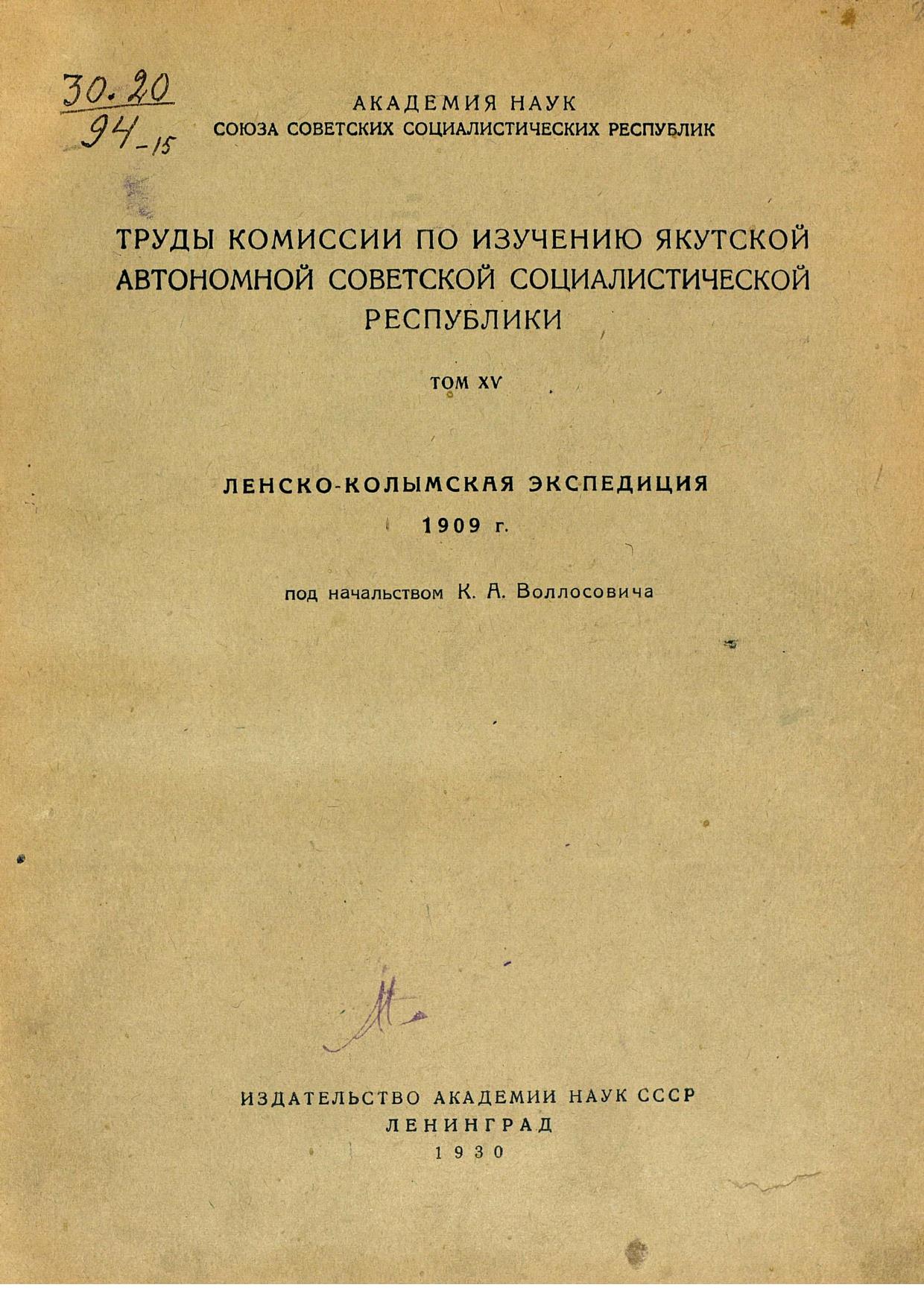 Ленско-Колымская экспедиция 1909 г. под нач. К. А. Воллосовича. — Л. 1930. — (АН ССР. Тр. ком. по изуч. Якут. авт. ССР).