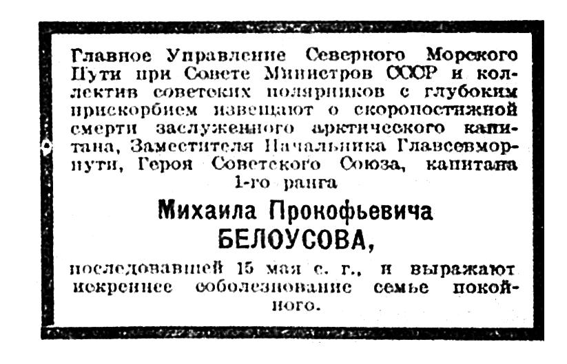 Главное Управление Северного Морского пути при Совете Министров СССР и коллектив советских полярников с глубоким прискорбием извещают о скоропостижной смерти заслуженного арктического капитана, Заместителя Начальника Главсевморпути, Героя Советского Союза, капитана 1-го ранга