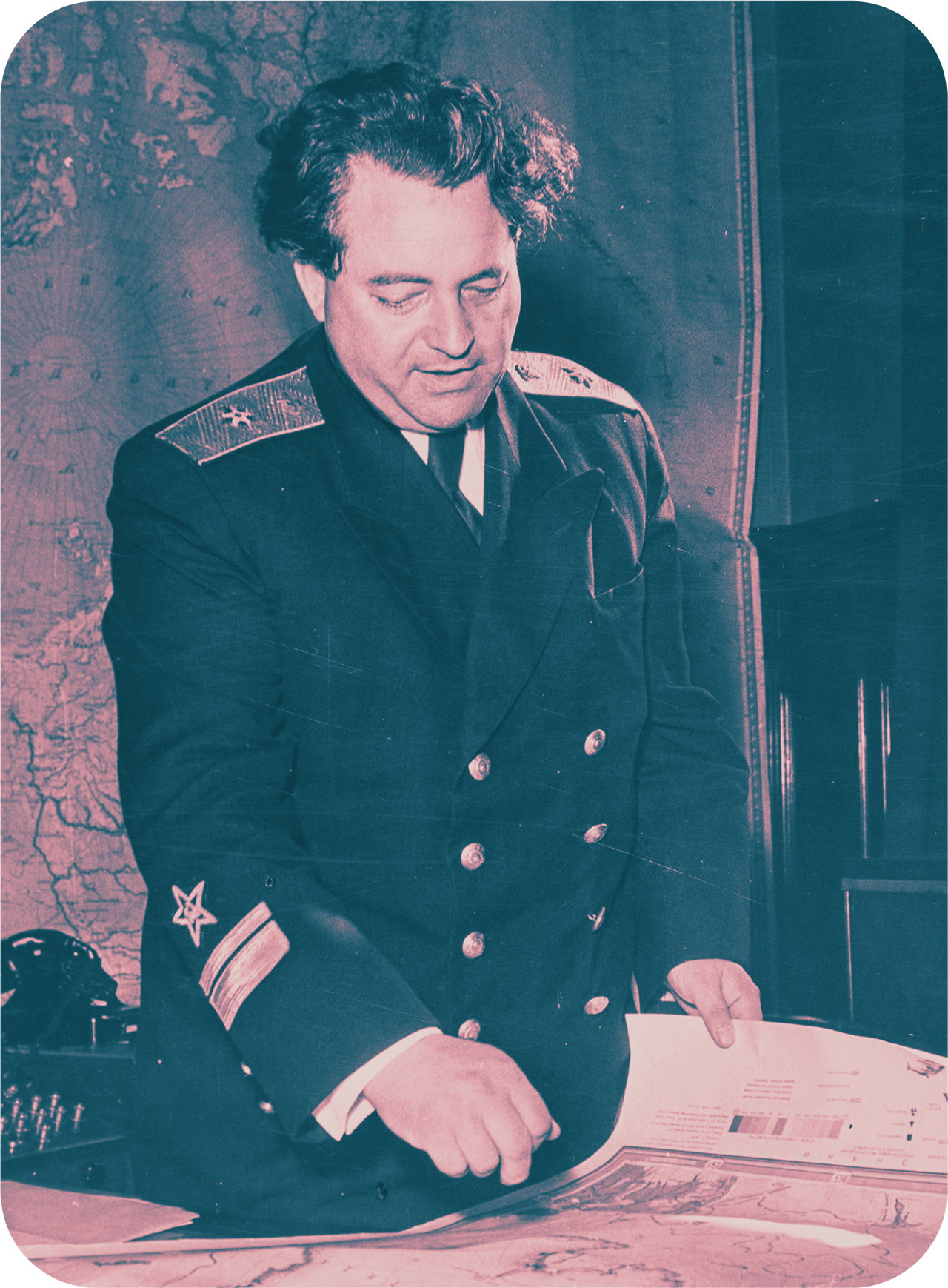 На нижнем снимке за ним, справа, вполоборота: генерал-майор авиации, Герой Советского Союза. Предположу, что М.В.Водопьянов (в штабе ВВЭ был консультантом).