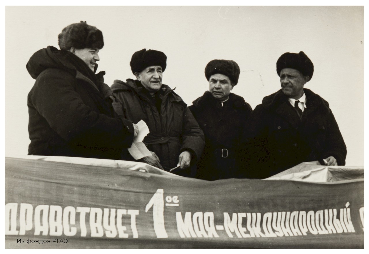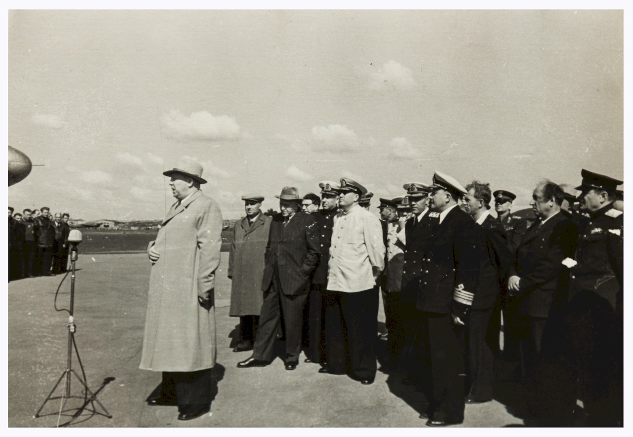Командование УПА и ГУСМП встречает министра МРФ З.А.Шашкова (справа). Первый слева, скорее всего, командир МАГОН, Герой Советского Союза И.С.Котов. В центре (в шапке) - В.Ф.Бурханов.