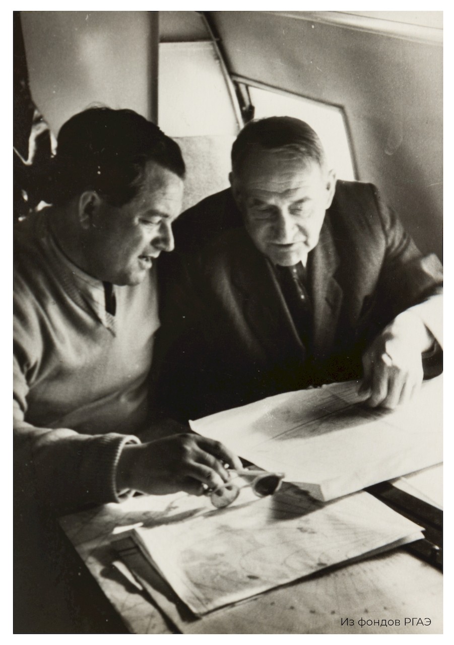 В.Ф.Бурханов (слева) и Д.И.Щербаков на борту самолёта