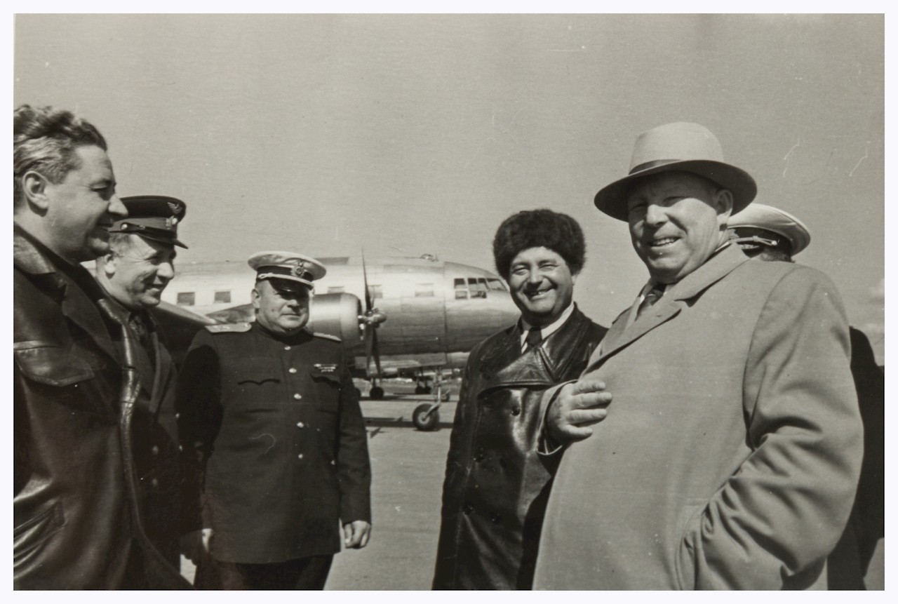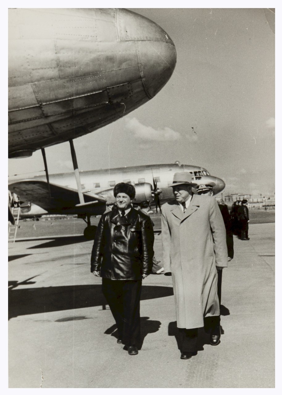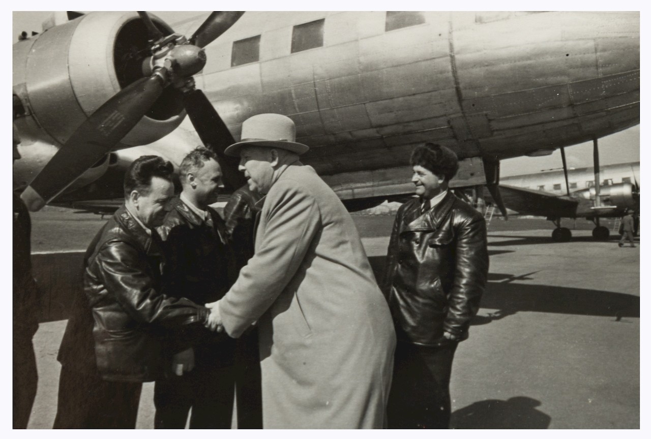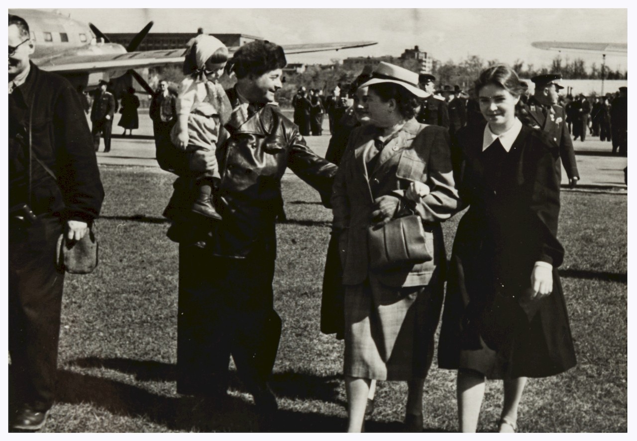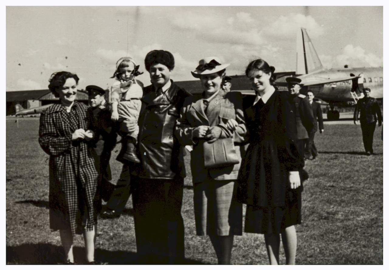 Очевидно, В.Ф.Бурханов с семьёй на аэродроме. На верхнем симке за ним - самолёт Ил-12 "СССР-11440" (в навигаторе отсутствует).