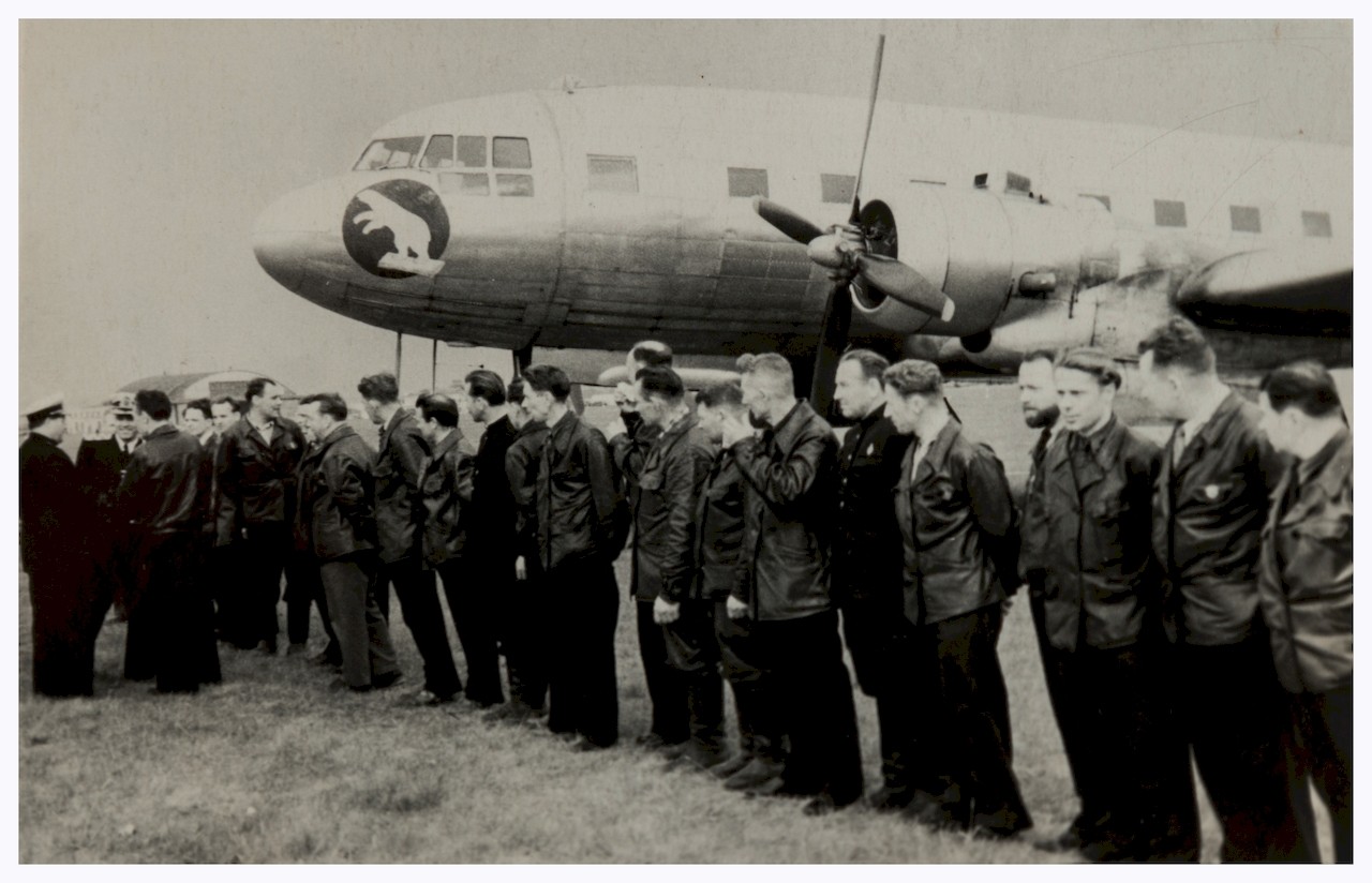 На борту самолёта Ли-2 «Н-532»: М.Е.Острекин, В.Ф.Бурханов, командир 1-го отряда - М.И.Черевичный, стоят - штурман - В.П.Падалко, гидролог - Н.А.Волков, третий - возможно, В.И.Аккуратов, сидит - академик Д.И.Щербаков. Крайний справа сидит - В.В.Фролов.