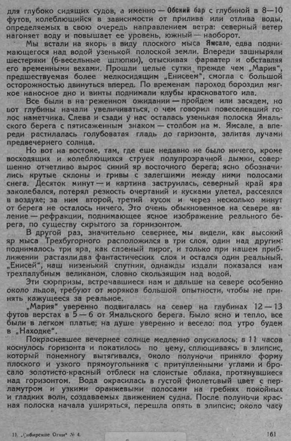„Мария" уверенно подвигалась на север на глубинах 12—13 футов верстах в 5 — 6 от Ямальского берега. Было ясно и тепло, все были в легком платье; на душе уверенно и весело: под утро будем в „Находке".