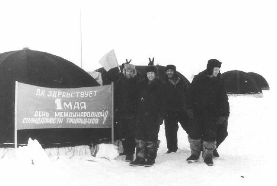 Первомайский митинг на дрейфующей льдине ВВЭ "Север-14" (слева-направо: начальник СГЭ СФ капитан 1 ранга Л.И.Сенчура, в центре - командир сводного ао УПА ГВФ, он же руководитель полётов, Герой Советского Союза В.А.Борисов, заместитель начальника СГЭ СФ капитан 1 ранга С.К.Немилов. 1 мая 1962 г.