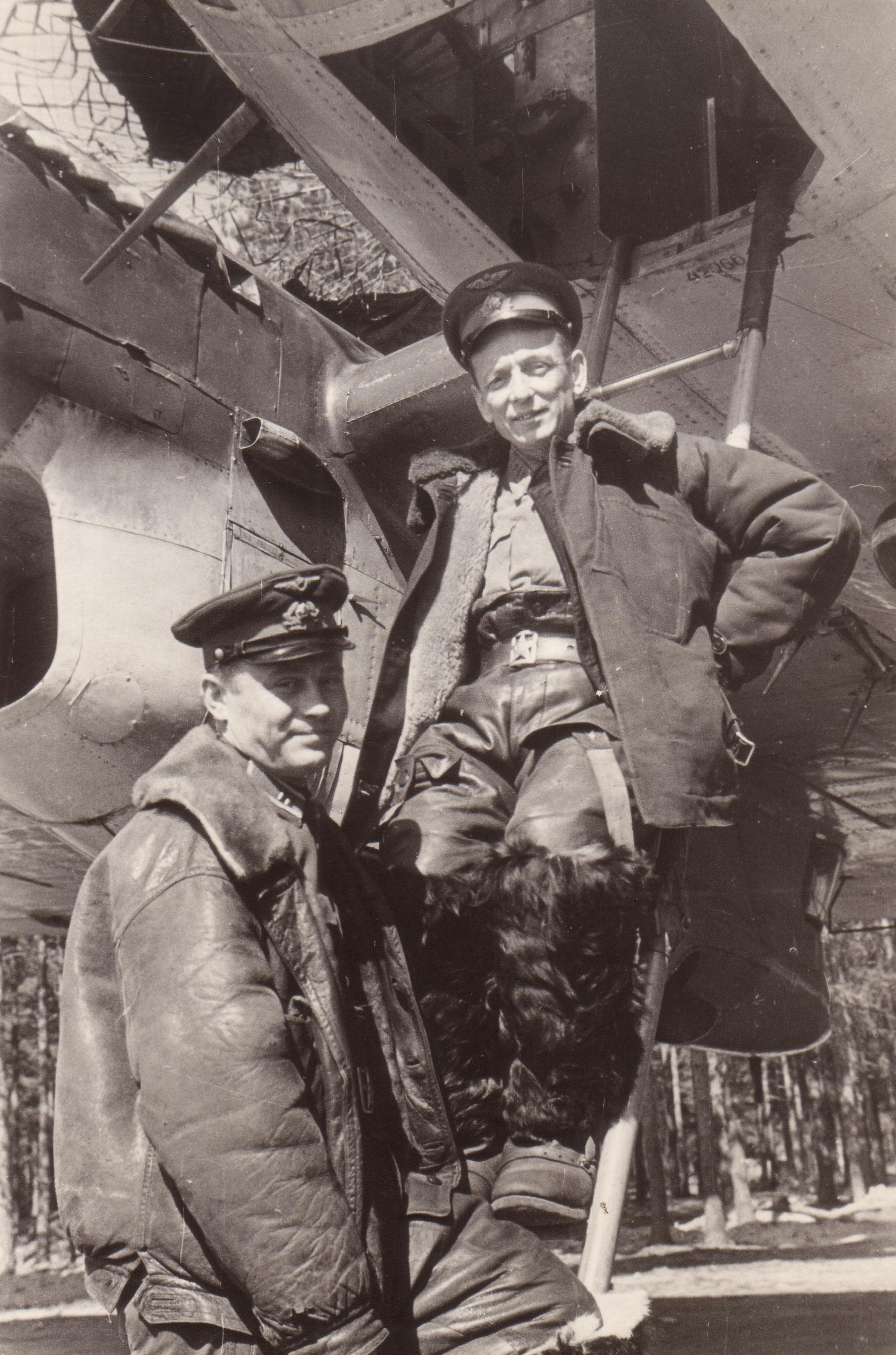 Герои Советского Союза майоры Эндель Карлович Пусэп (Пуусэпп) (слева) и Александр Павлович Штепенко у бомбардировщика Пе-8 (ТБ-7).