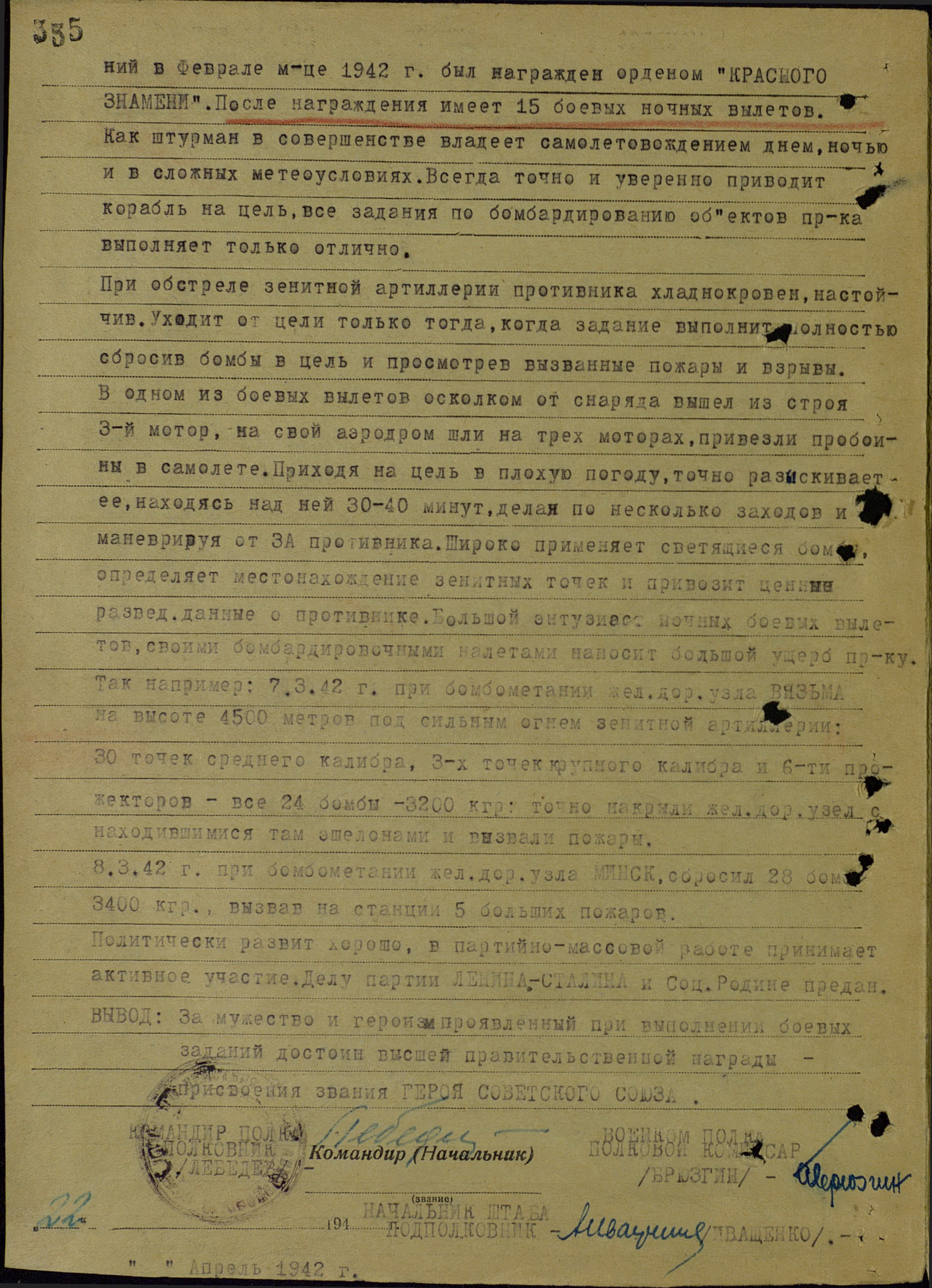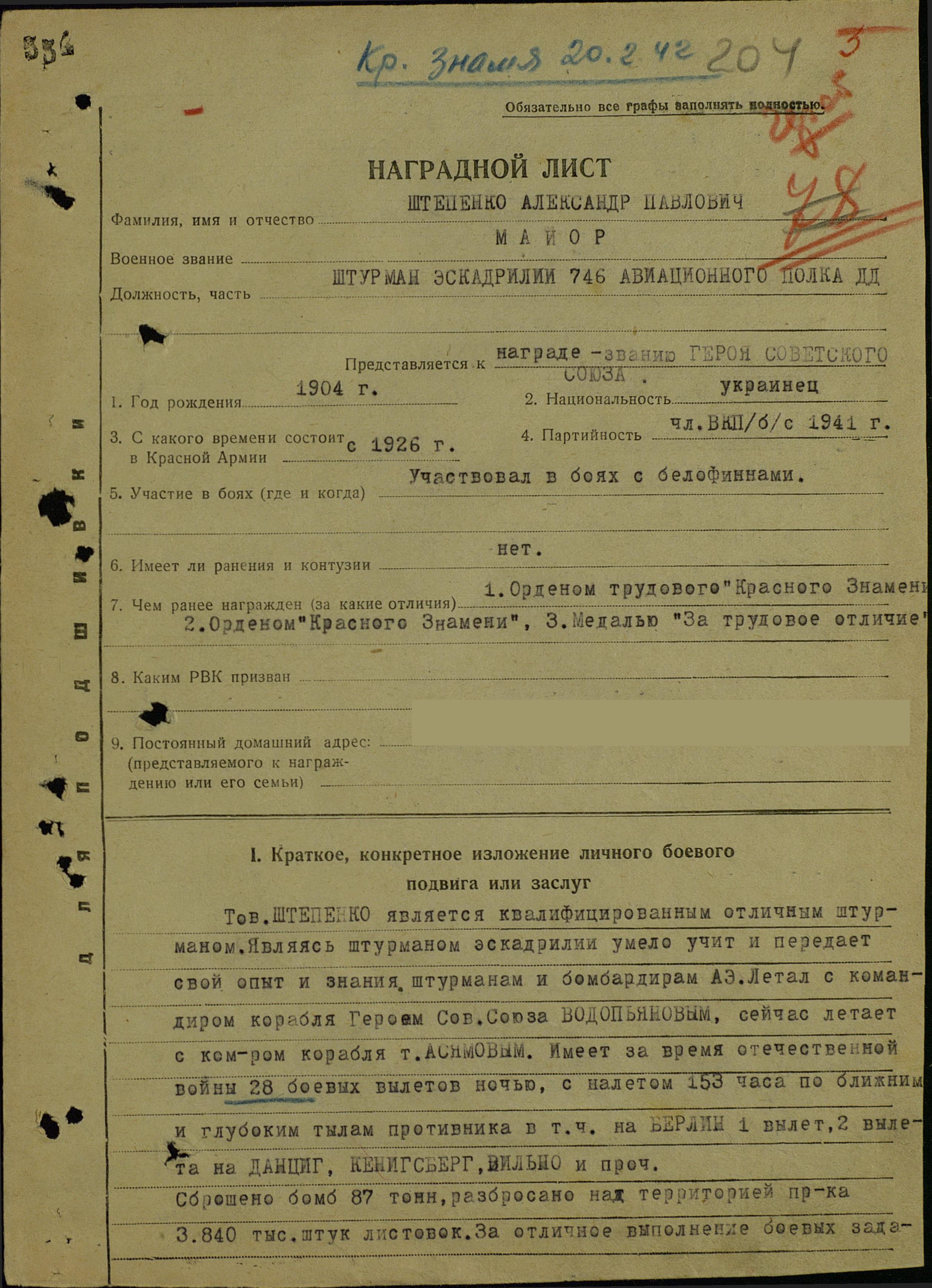 Штурман эскадрильи 746-го авиаполка дальнего действия капитан Штепенко А.П. к концу апреля 1942 года совершил 28 боевых вылетов на бомбардировку военно-промышленных объектов в глубоком тылу противника, в том числе столицы гитлеровской Германии Берлина и Кенигсберга (ныне Калининград – областной центр).