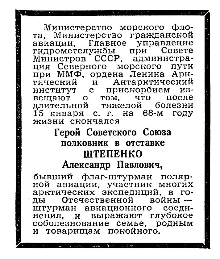 Министерство морского флота, Министерство гражданской авиации. Главное управление Гидрометслужбы при Совете Министров СССР, администрация Северного морского пути при ММФ, ордена Ленина Арктический и Антарктический институт с прискорбием извещают о том, что после длительной тяжелой болезни 15 января с. г. на 68-м году жизни скончался