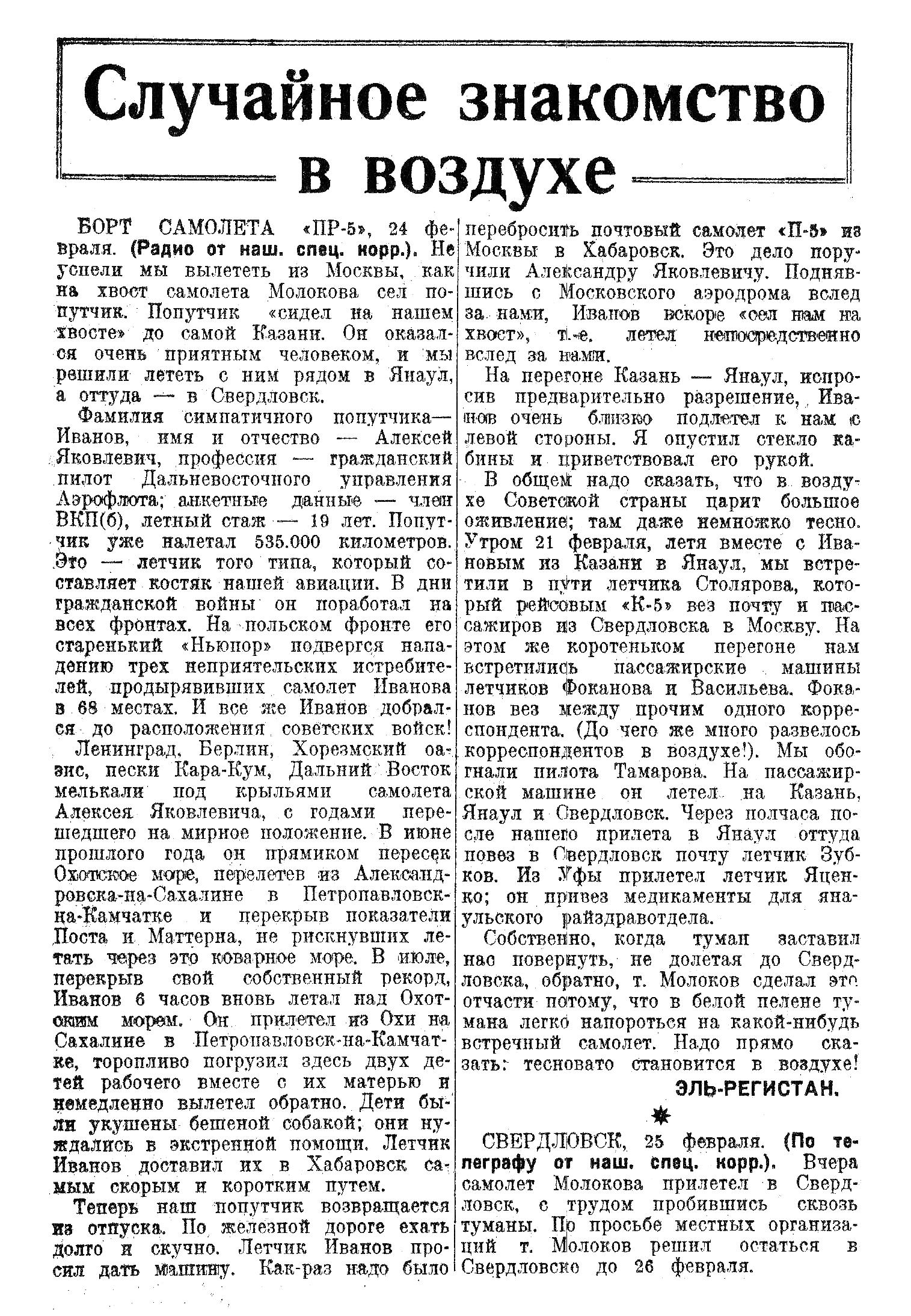 Фамилия симпатичного попутчика — Иванов, имя и отчество — Алексей Яковлевич, профессия — гражданский пилот Дальневосточного управления Аэрофлота; анкетные данные — член ВКП(б), летный стаж — 19 лет. Попутчик уже налетал 535.000 километров. Это — летчик того типа, который составляет костяк нашей авиации. В дни гражданской войны он поработал на всех фронтах. На польском фронте его старенький «Ньюпор» подвергся нападению трех неприятельских истребителей, продырявивших самолет Иванова в 68 местах. И все же Иванов добрался до расположения советских войск!