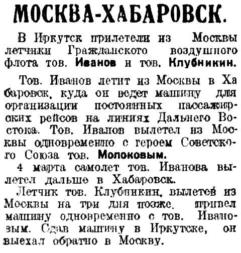 4 марта самолет тов. Иванова вылетел дальше в Хабаровск.