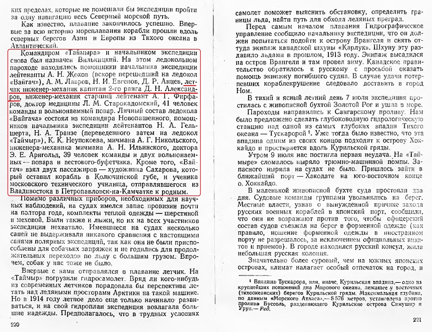 "На этом ледокольном пароходе находились..., летчик инженер-механик капитан 2-го ранга Д.Н. Александров, инженер-механик старший лейтенант А.Г. Фирфанов,..."