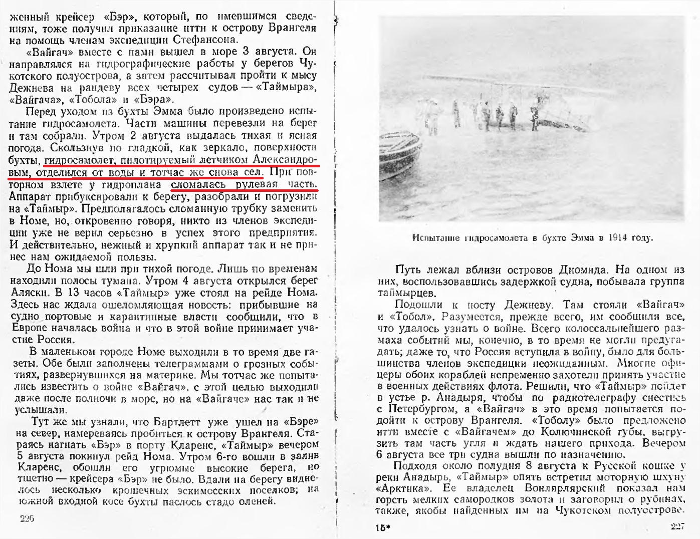 "Перед уходом из бухты Эмма было произведено испытание гидросамолета. Части машины перевезли на берег и там собрали.