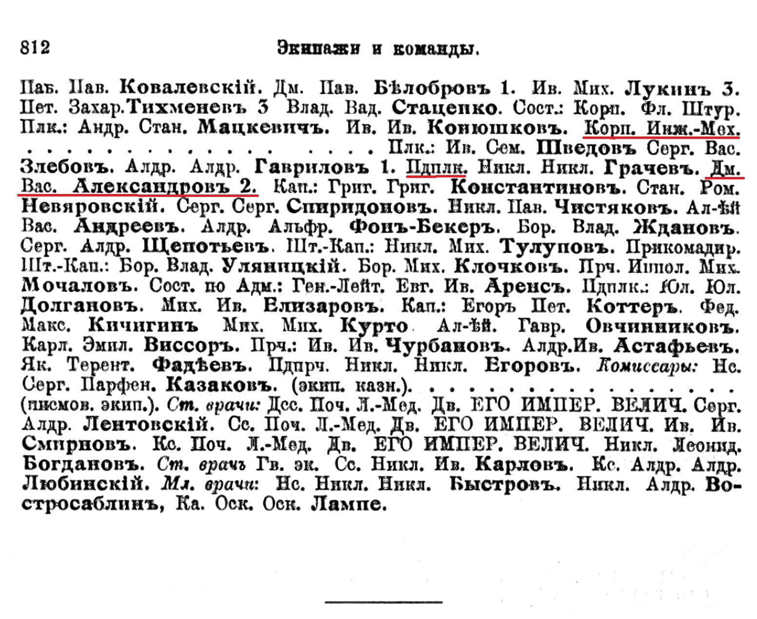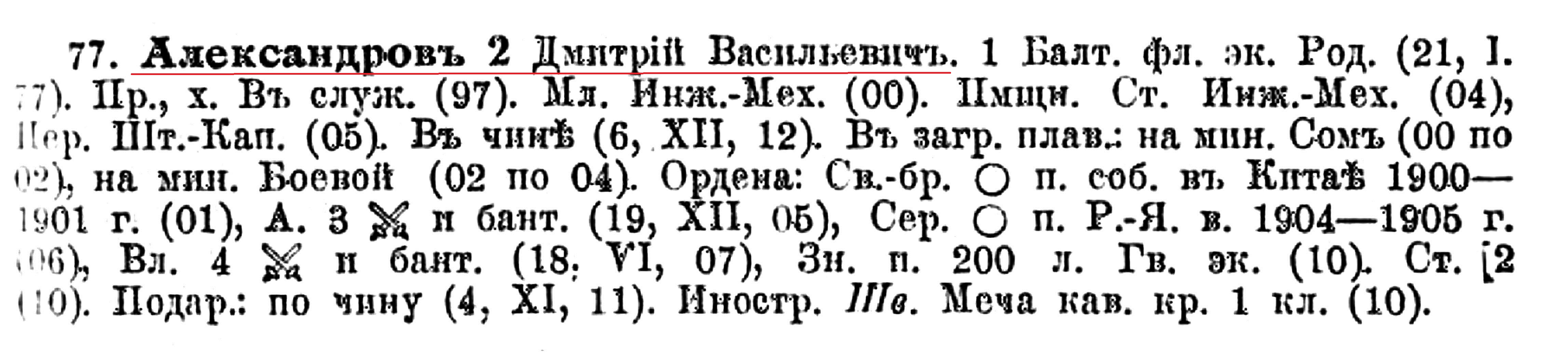 В Списках личного состава судов Флота, строевых и административных учреждений Морского Ведомства в 1911-1914 гг. иные Дмитрии Александровы не указаны: