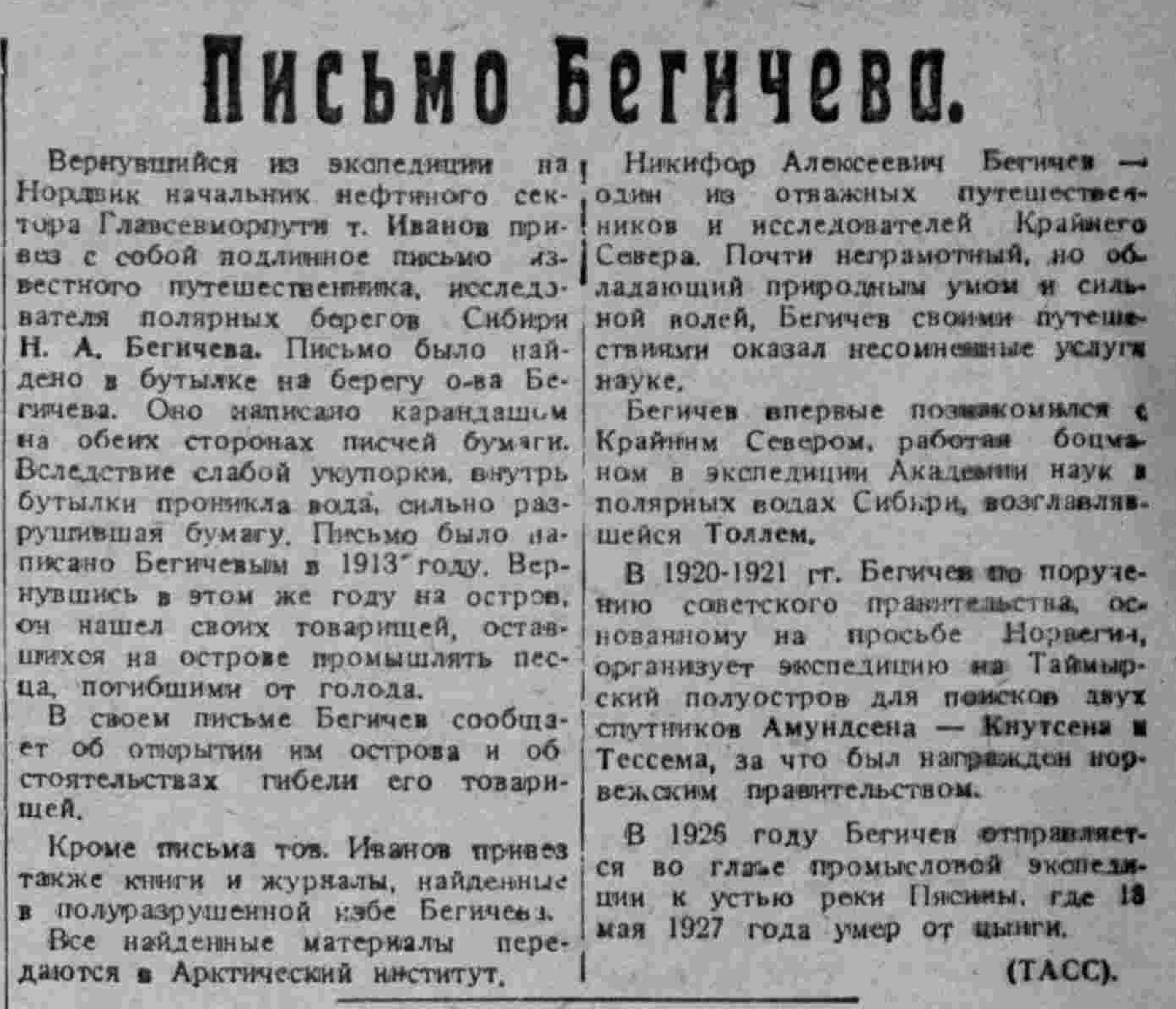 На мысе Вильда у склада продовольствия, оставленного командой "Эклипса" еще в 1915 г. , Бегичев нашел письмо Теосема и Кнудсена.