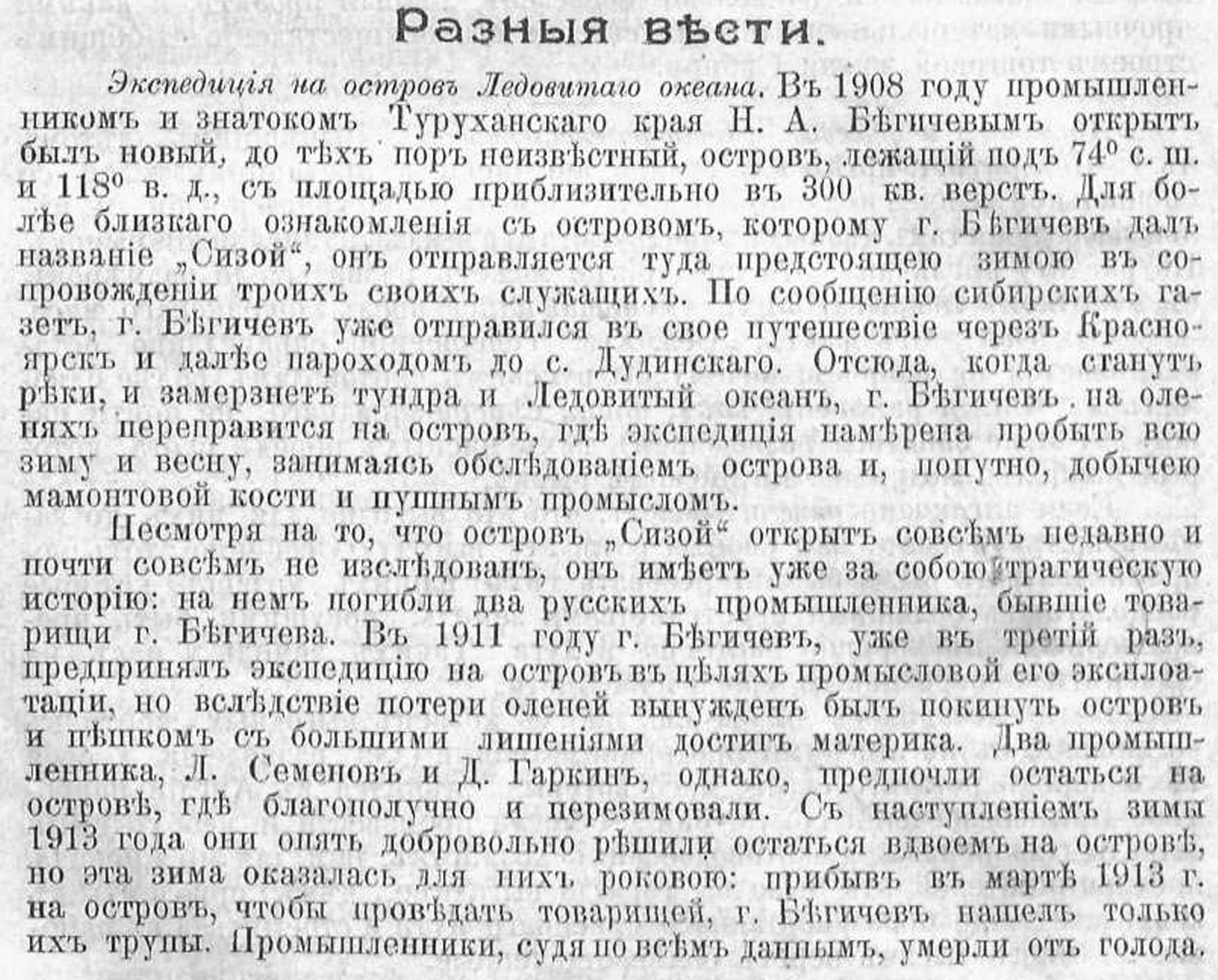Рассказ Бетту заинтересовал Бегичева. Он решил во что бы то ни стало побывать на таинственном острове. Осуществить это желание ему удалось лишь в 1908 г. , когда Бегичев, вместе с промышленниками Диомидом Уксусниковым и Николаем Семеновым, прибыл к устью Хатангского залива.