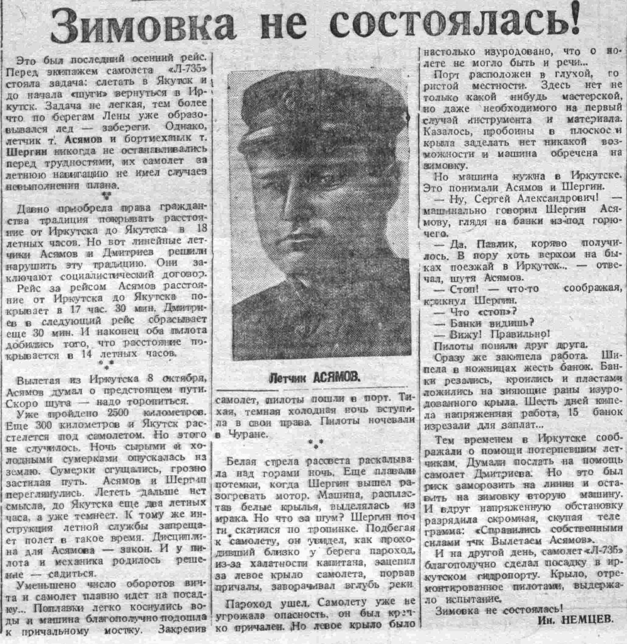 Уже в первую зимнюю навигацию он блестяще справлялся со своей работой. На воздушной линии Якутск – Иркутск существовал неписаный закон: право открытия навигации предоставлялось лучшему пилоту — первым в лето 1935 года приводнился на акватории Якутского гидропорта самолёт, управляемый С.А. Асямовым.