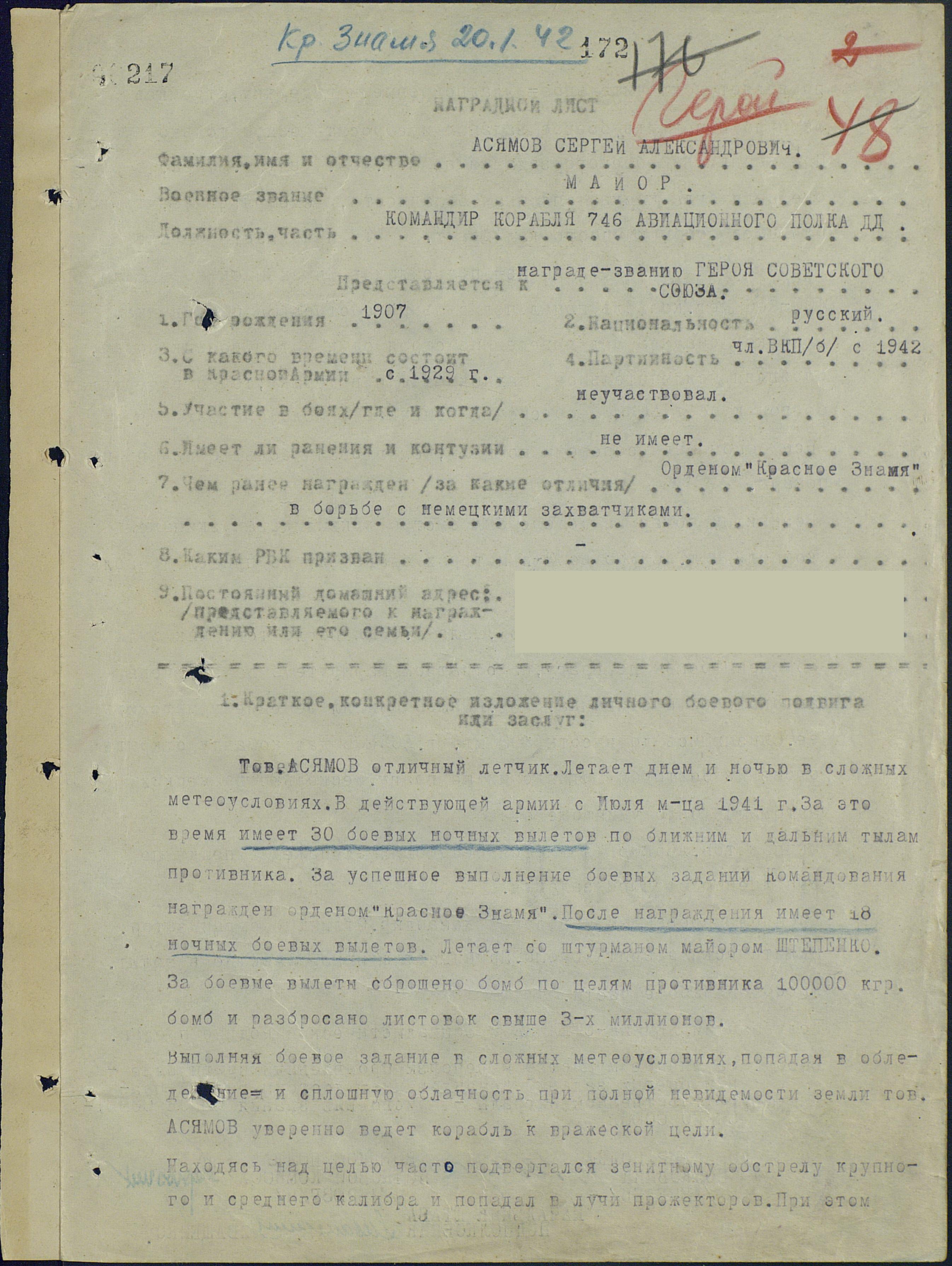 Тов. АСЯМОВ отличный летчик. Летает днем и ночью в сложных метеоусловиях. В действующей армии с Июля м-ца 1941 г. За это время имеет 30 боевых ночных вылетов по ближним и дальним тылам противника. За успешное выполнение боевых задании командования награжден орденом"Красное Знамя". После награждения имеет 18 ночных боевых вылетов. Летает со штурманом майором ШТЕПЕНКО.