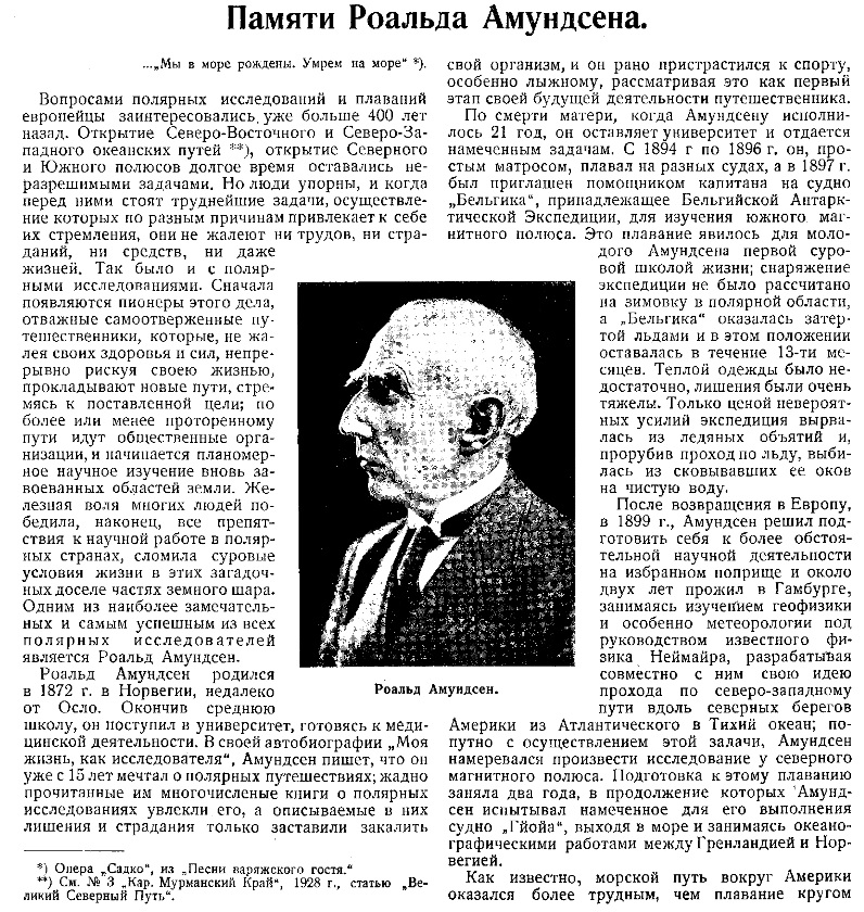 Имя великого норвежского полярного исследователя Руала Амундсена пользуется в Стране Советов большой популярностью. С именем Амундсена у нас прежде всего связывается представление о высшем проявлении человеческой воли в борьбе с силами природы. Почти сказочные дела, совершенные этим «викингом двадцатого века», и его трагическая, но прекрасная смерть окружают величавую фигуру норвежца ореолом романтизма – того романтизма, который присущ всякому героическому делу и который позволяет считать нашу эпоху социалистической стройки наиболее романтичной.
