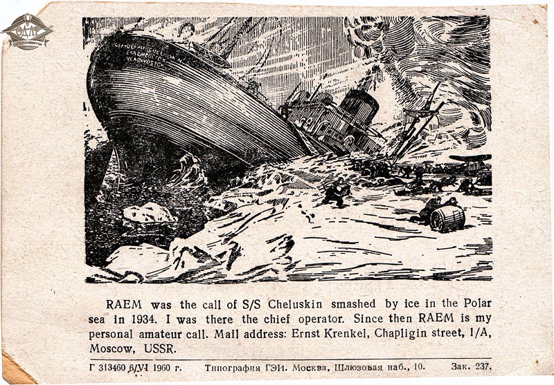 :": Благодаря Участнику Форумов Алексею Дмитриевичу, у нас появилась возможность увидеть во всех деталях еще одну раритетную QSL-карточку Э.Т.Кренкеля, образца 1960 года, отпечатанную в Москве, в типографии ГЭИ на Шлюзовой набережной. Карточка во многом напоминает ту, что продавалась на Молотке, но оборот её более динамичен и живописен: на нём оттиснута лаконичная гравюра, выполненная профессиональным книжным графиком и изображающая момент гибели легендарного парохода "Челюскин"...