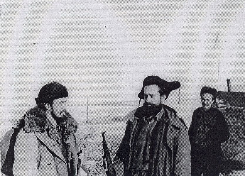 Комментарий самого Белого к снимку: "С А.К. Власенко уходим на поиски про павшего без вести рабочего соседней партии. Справо сзади - техник-оператор В.Г. Семенов, остающийся старшим на базе, бывший начальник разведки партизанского отряда Медведева."