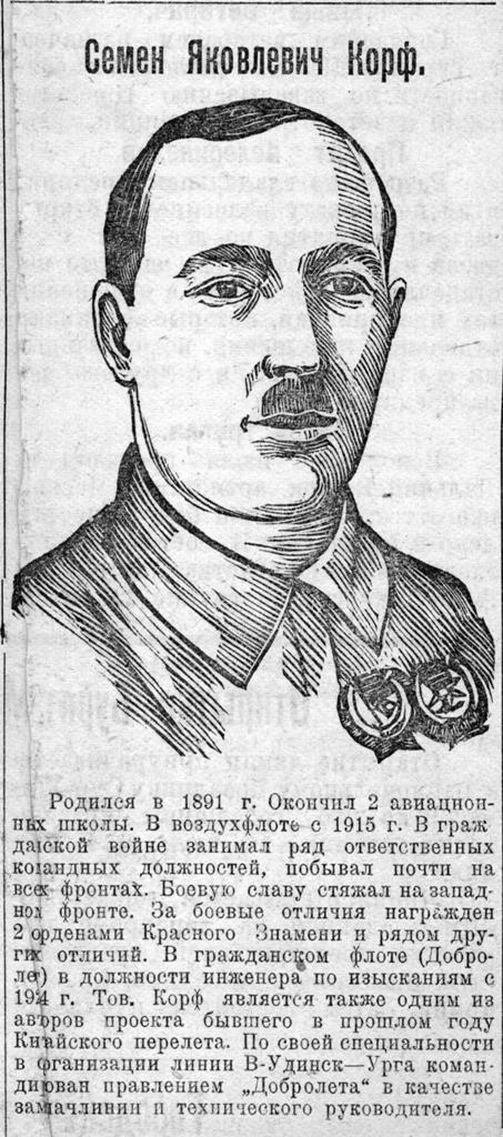 Вышеназванную авиалинию позднее назовут Сахалинской почтово-пассажирской. Изыскательские работы на ней возглавил известный пилот-изыскатель Семен Яковлевич Корф. До революции он состоял на царской службе, но с первых дней советской власти принял сторону народа, боролся с белогвардейцами и контрреволюционерами. Одно время командовал красной авиацией Западного фронта, смело воевал с врагами молодой Республики Советов, за что трижды удостоился высшей революционной награды - ордена Красного Знамени. После Гражданской войны С.Я. Корф возглавил Военно-воздушные силы Московского военного округа, позднее стал главным инспектором Военно-воздушных сил страны.