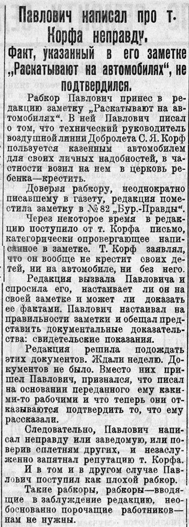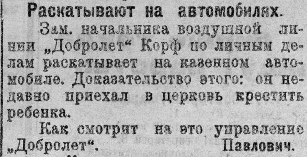 Рабкор Павлович принес в редакцию заметку „Раскатывают на автомобилях". В ней Павлович писал о том, что технический руководитель воздушной линии Добролета С. Я. Корф пользуется казенным автомобилем для своих личных надобностей, в частности возил на нем в церковь ребенка — крестить.