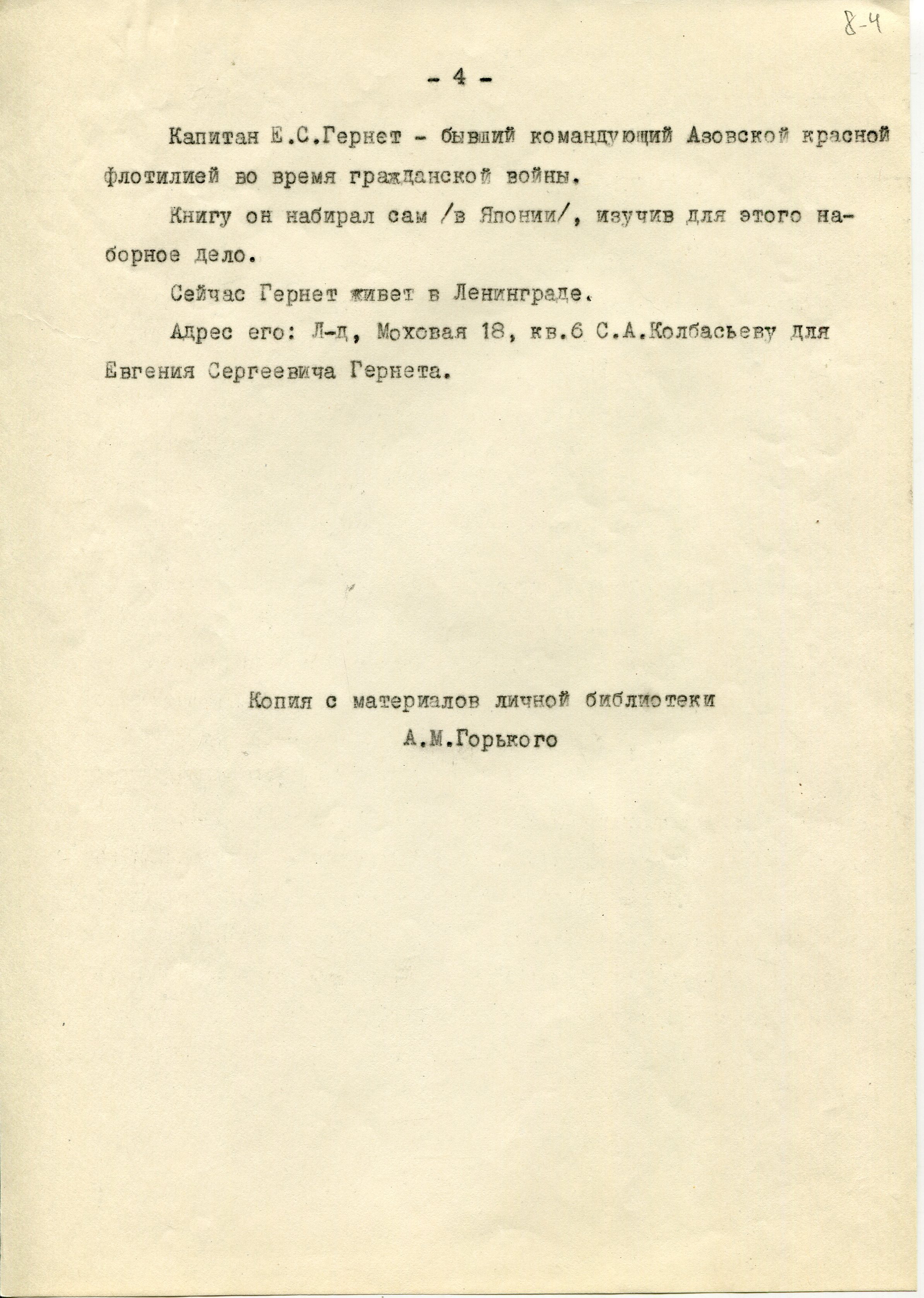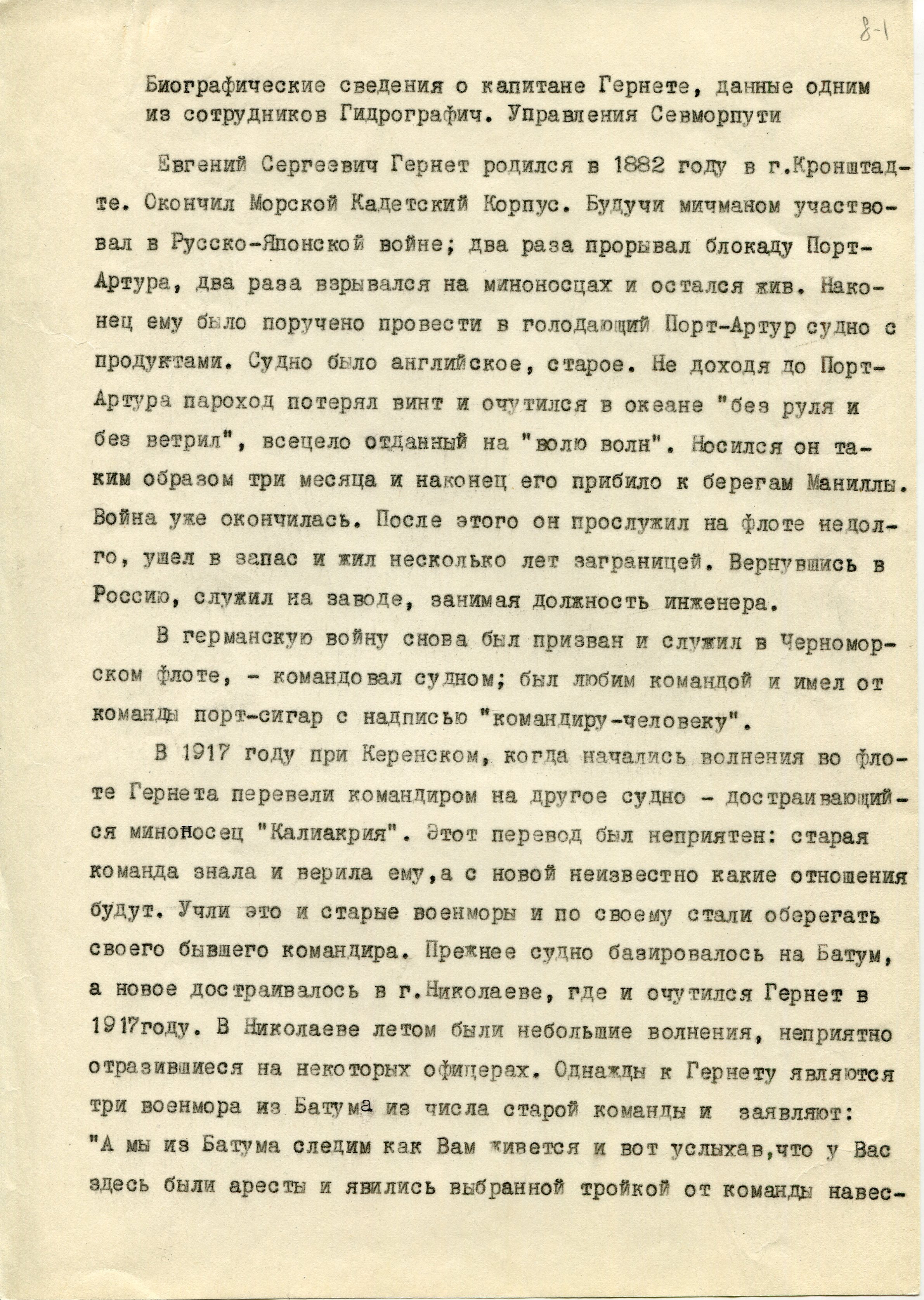 (15) Справка о капитане Гернете начальника Гидрографического Управления Главсевморпути, 1934 г./ Институт мировой литературы им. Горького, музей А.М.Горького, № 1402, 1.11.1983.