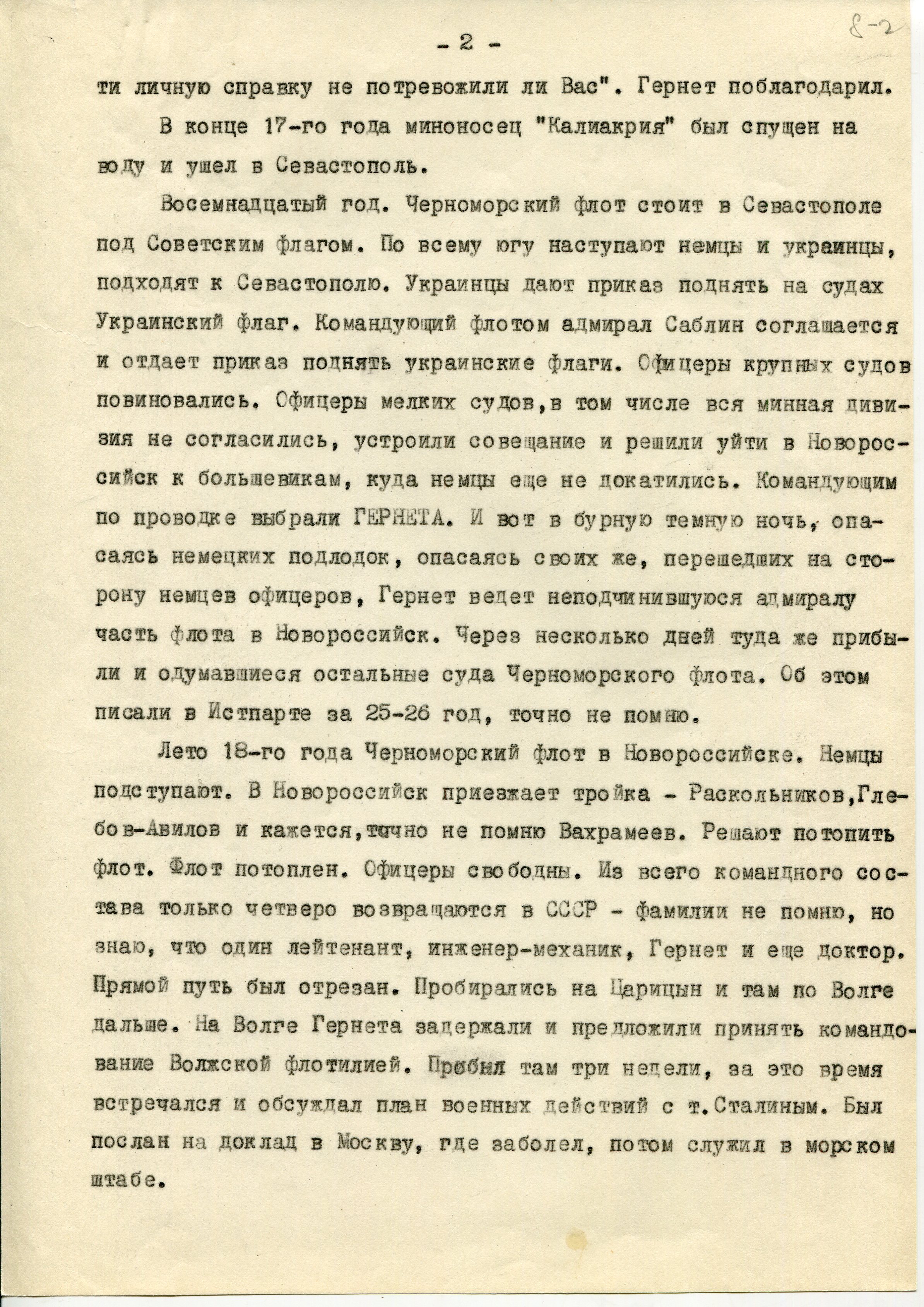 В ночь с 29 на 30 апреля 1918 г. Гернет командует флотом из 11 миноносцев и 10 сторожевых катеров-истребителей подводных лодок, уходящих из Севастополя в Новороссийск, чтобы избежать захвата их немцами, а 18 июня, ввиду безвыходности положения, утапливает флот, в том числе свою "Калиакрию", в Цемесской бухте (17).