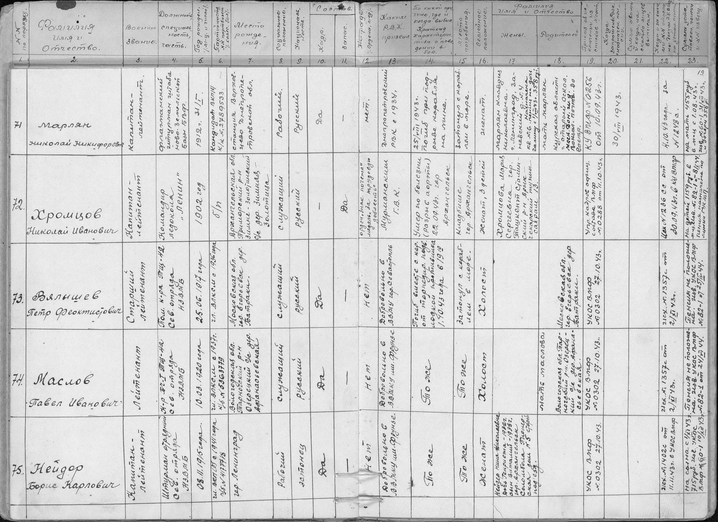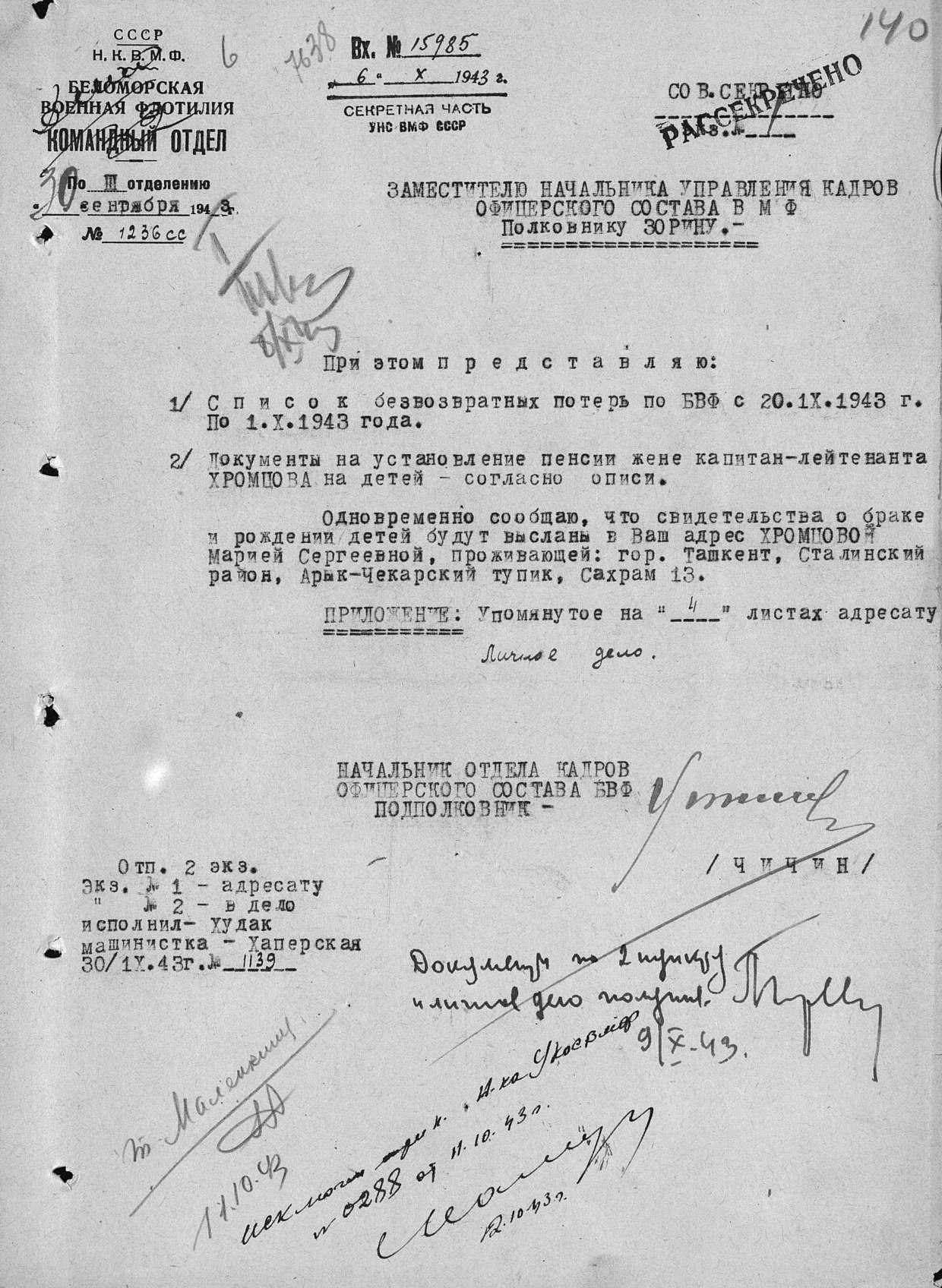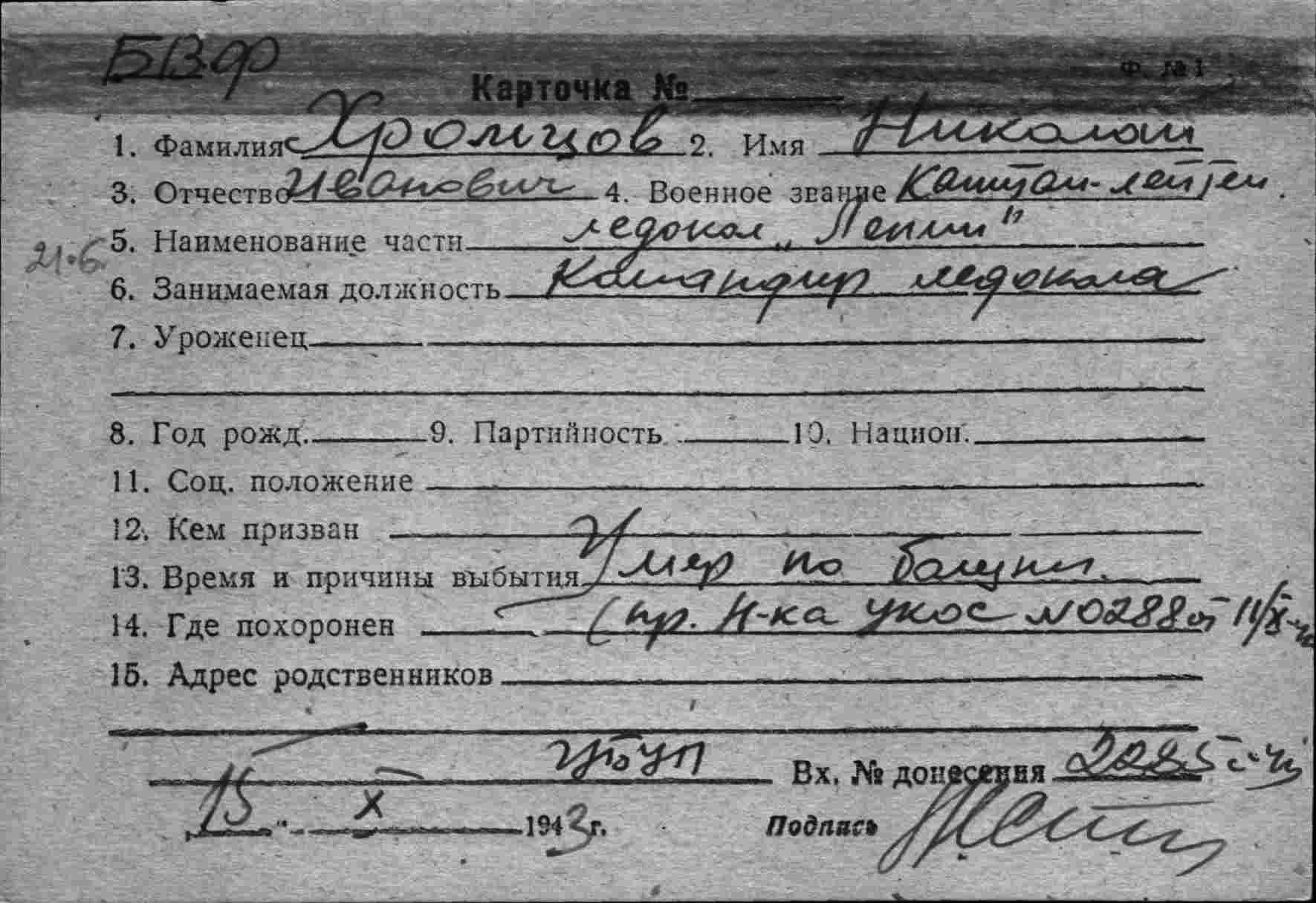 «С глубоким прискорбием сообщаю, что в 23 часа 30 минут 23 сентября сего года после весьма непродолжительной болезни (одни сутки) Ваш муж и мой командир капитан-лейтенант Хромцов Николай Иванович скончался от разрыва аорты. Выражаю Вам свои искренние соболезнования по поводу безвременной кончины Николая Ивановича».