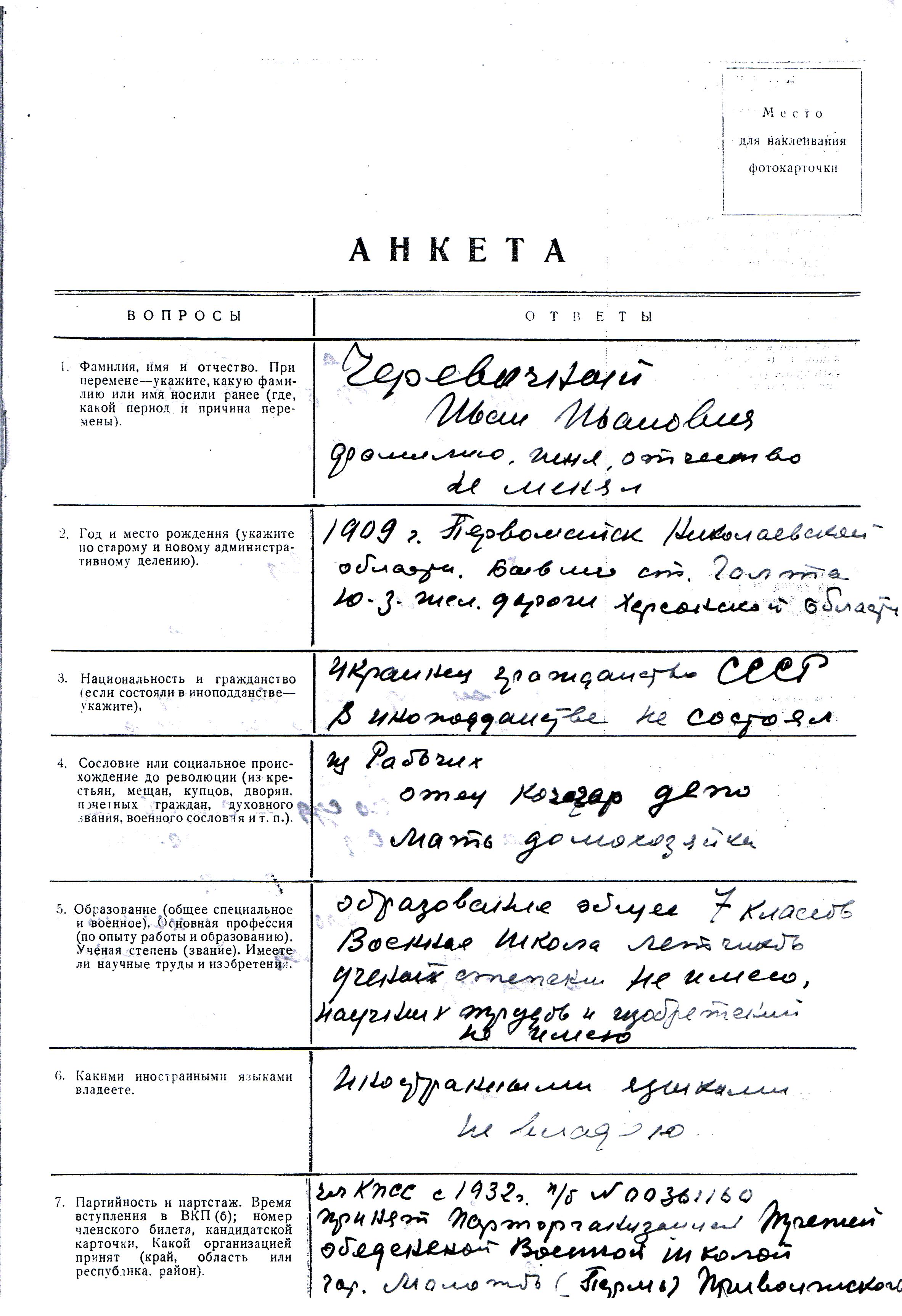 Для любителей Полярной авиации позволю добавить копию выездного дела И.И.Черевичного - первого командира ао 1-й КАЭ, составленного его рукой перед командировкой в Антарктиду 1 сентября 1955 г.